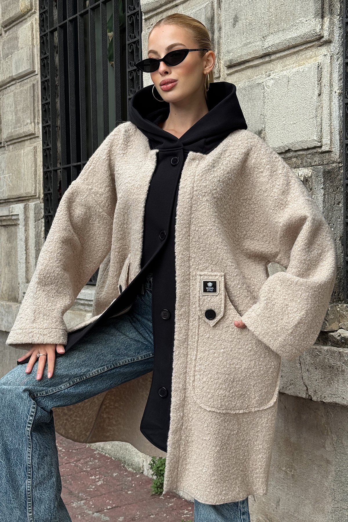 Kadın Bej Kapüşonlu Çift Cepli Düğme Kapamalı Kaşe Kaban VS01288 (VS01288)
