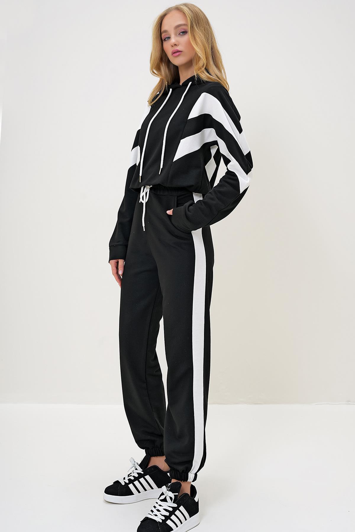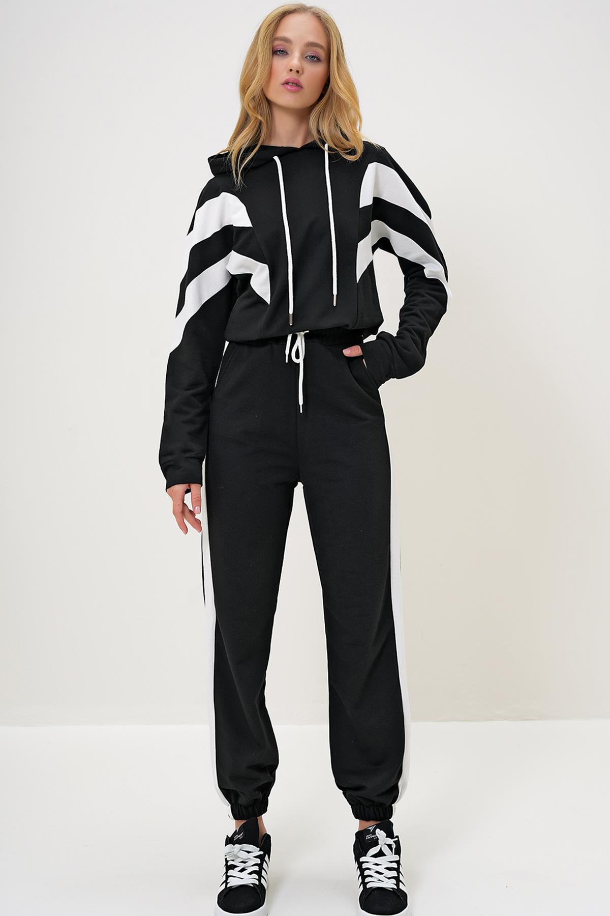 Kapüşonlu Renk Bloklu İki İplik Sweatshırt Ve Paçası Lastikli Eşofman Takımı - Siyah (ALC-X13094)