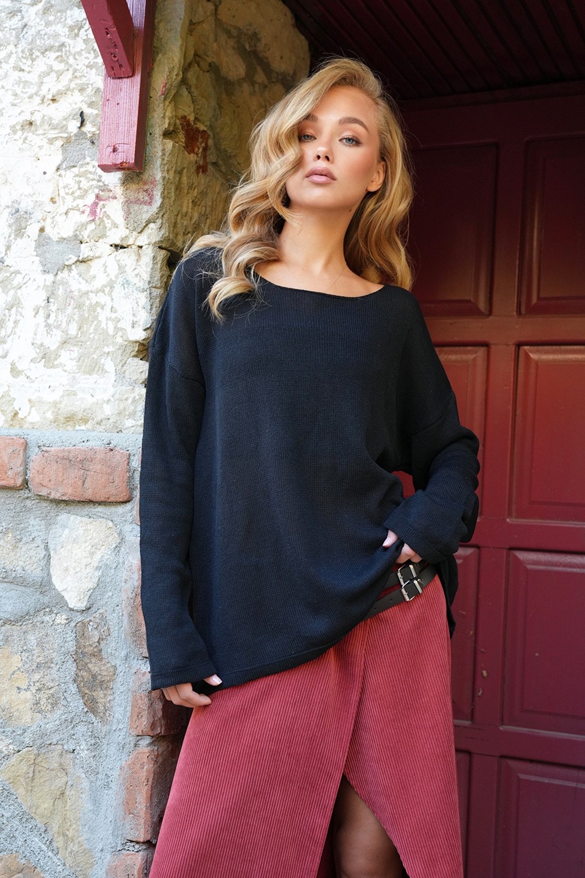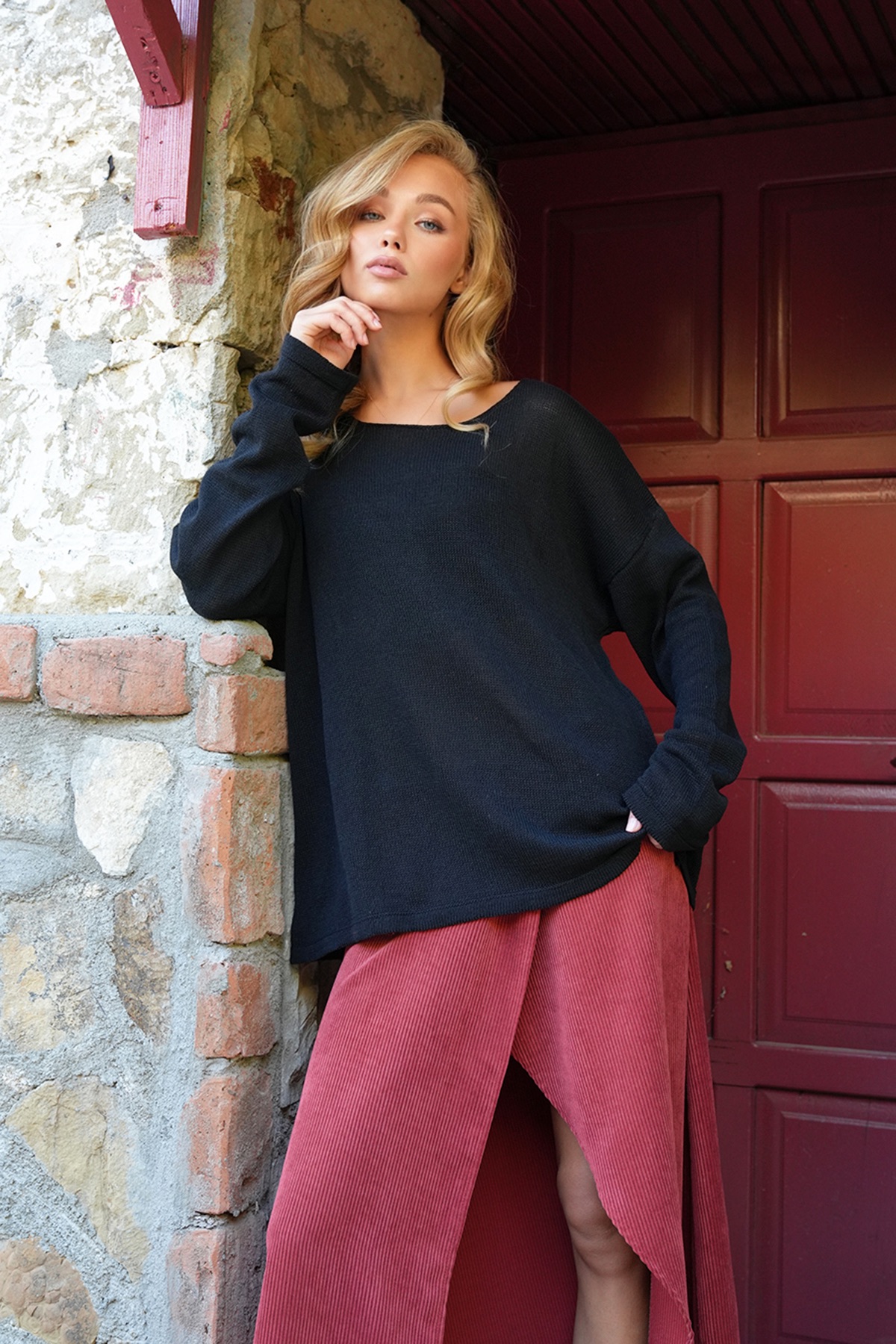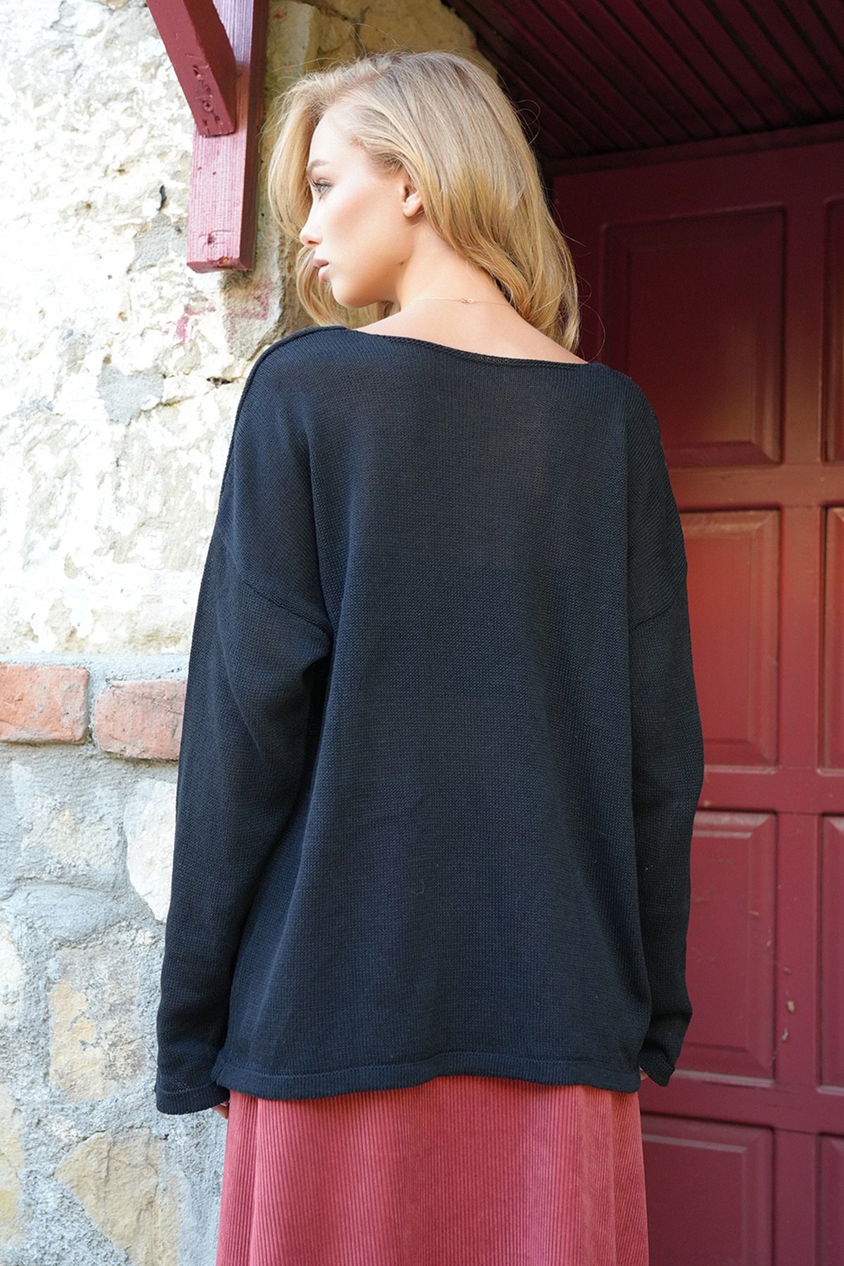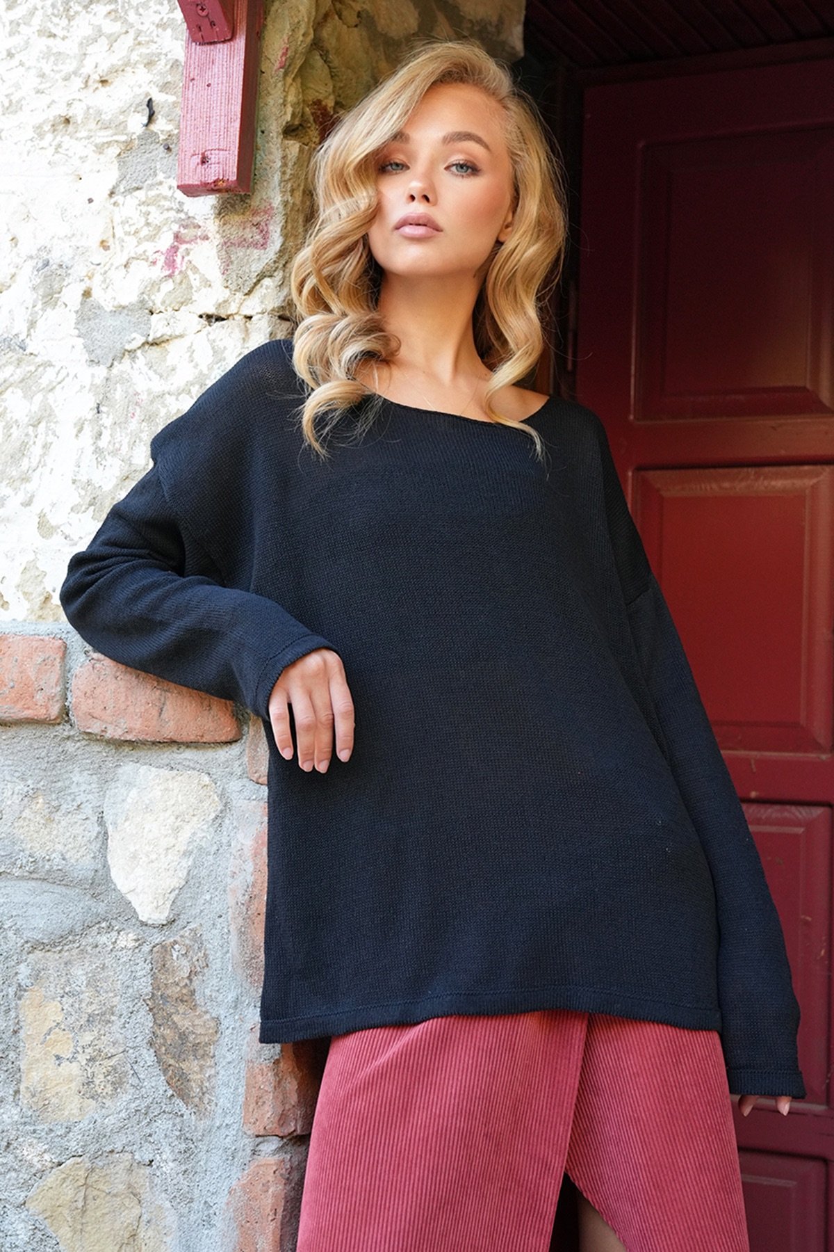 Kayık Yaka İnce Örme Kazak - Siyah (ALC-X14468)