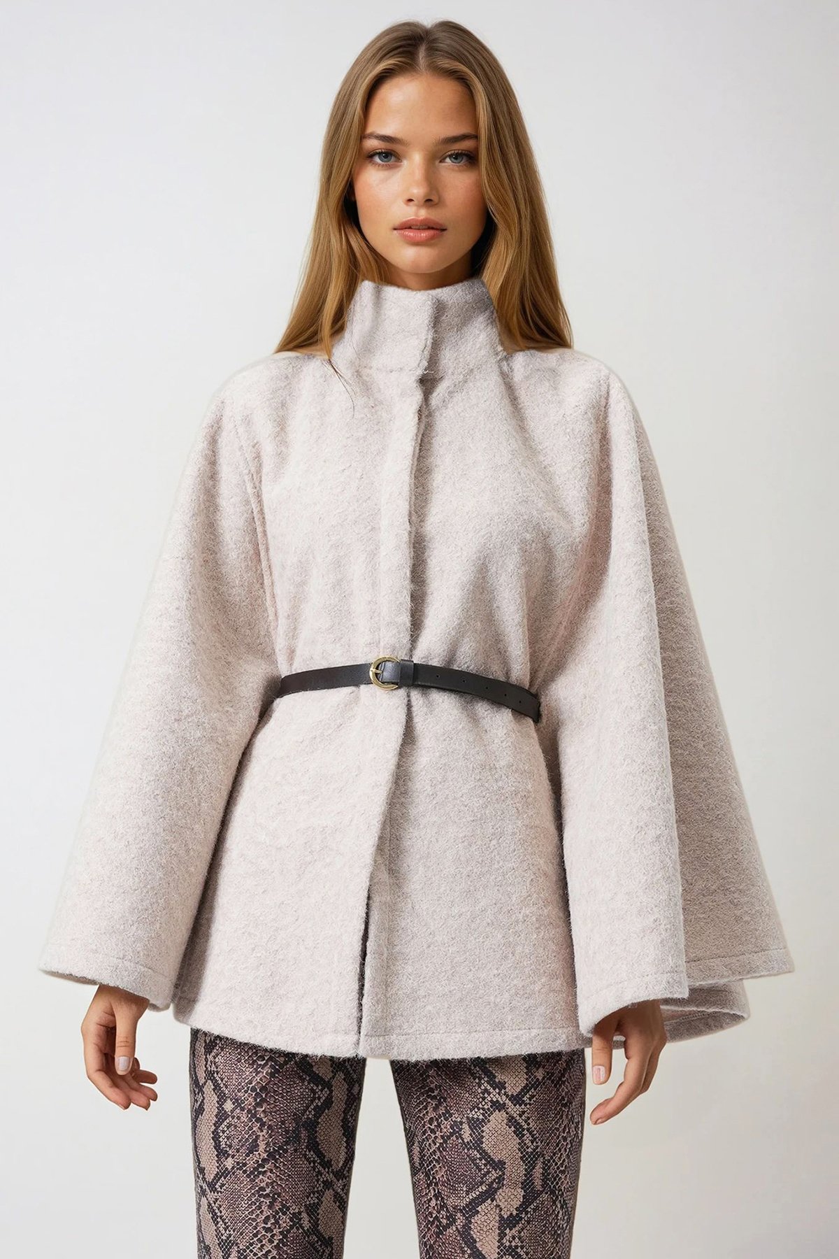 Kemerli Gizli Düğmeli Premium Pelerin - BEJ (VS01011)