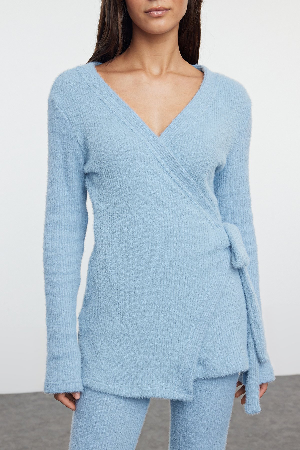 Kruvaze Yaka Bağlamalı Bluz ve İspanyol Paça Pantolon Takım - BEBE MAVİ