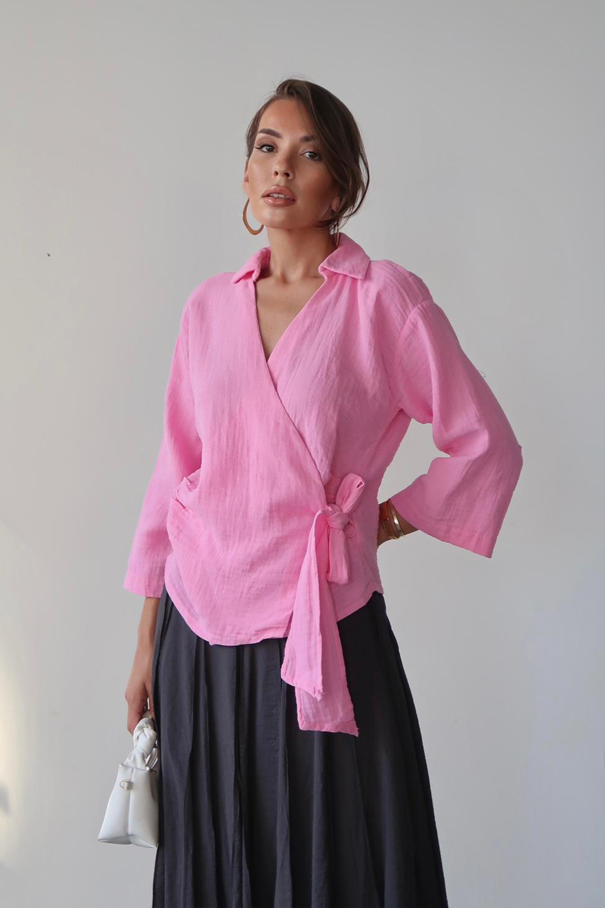 Kruvaze Yaka Bağlamalı Müslin Bluz (VS00677)