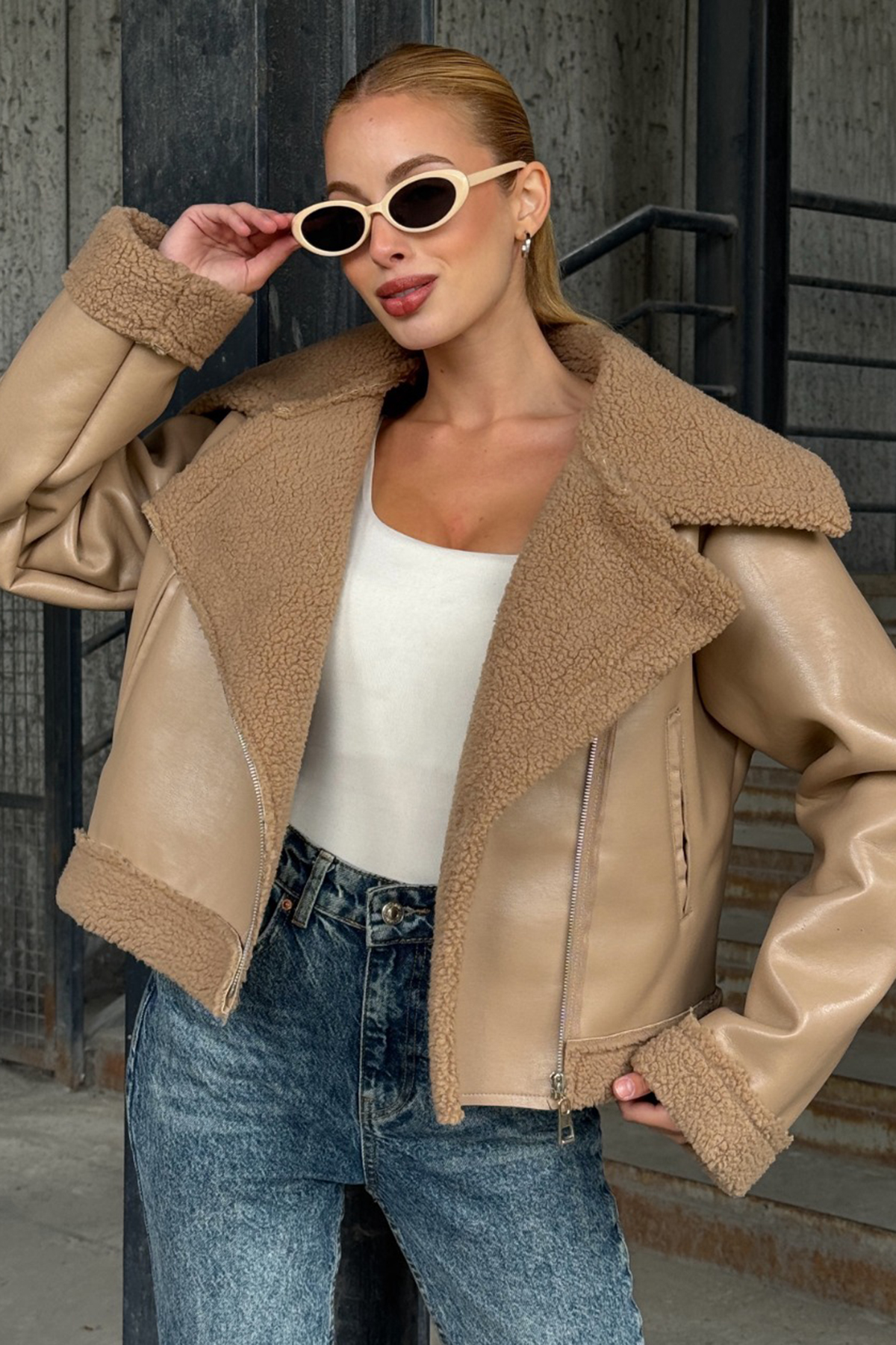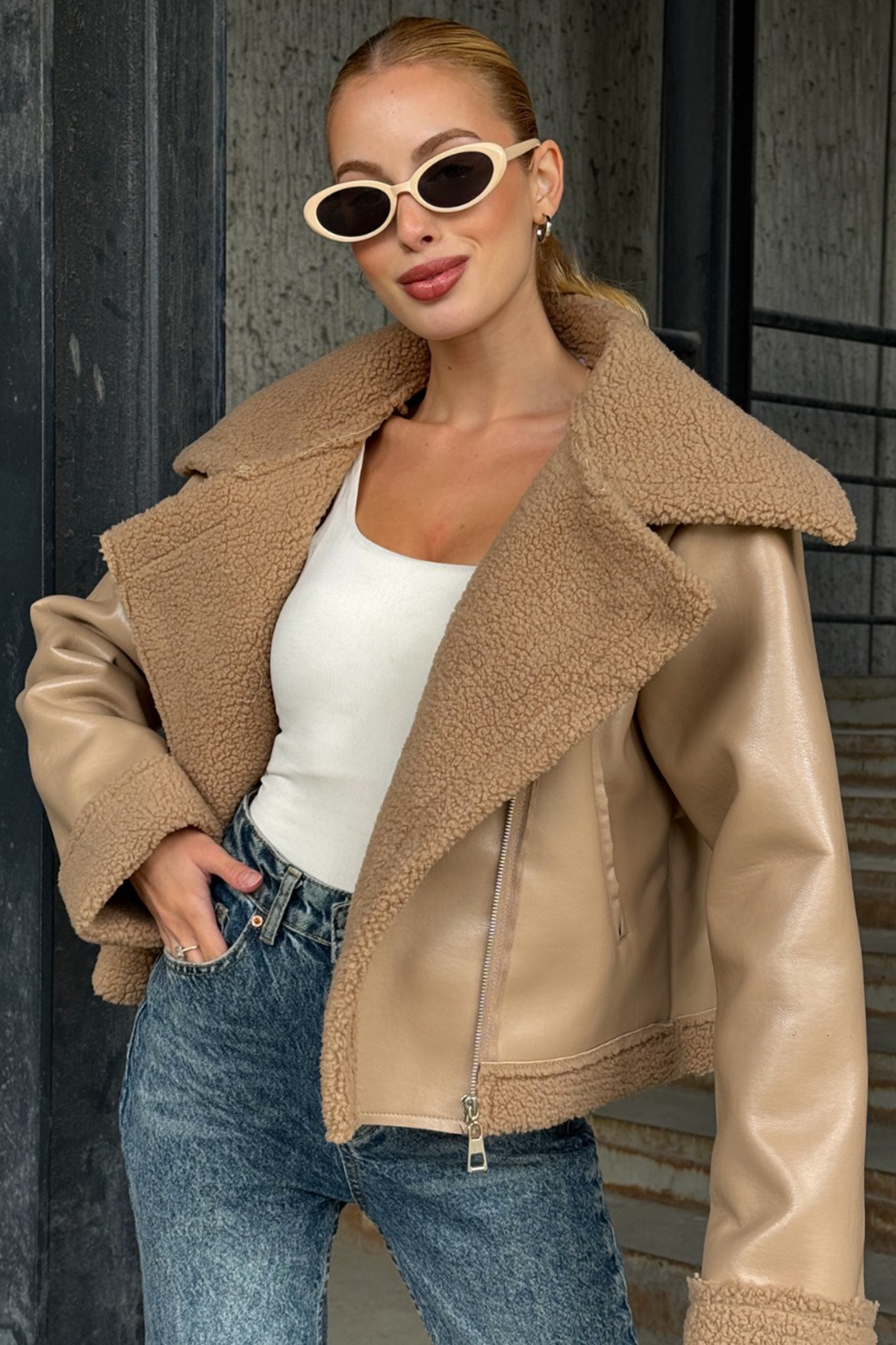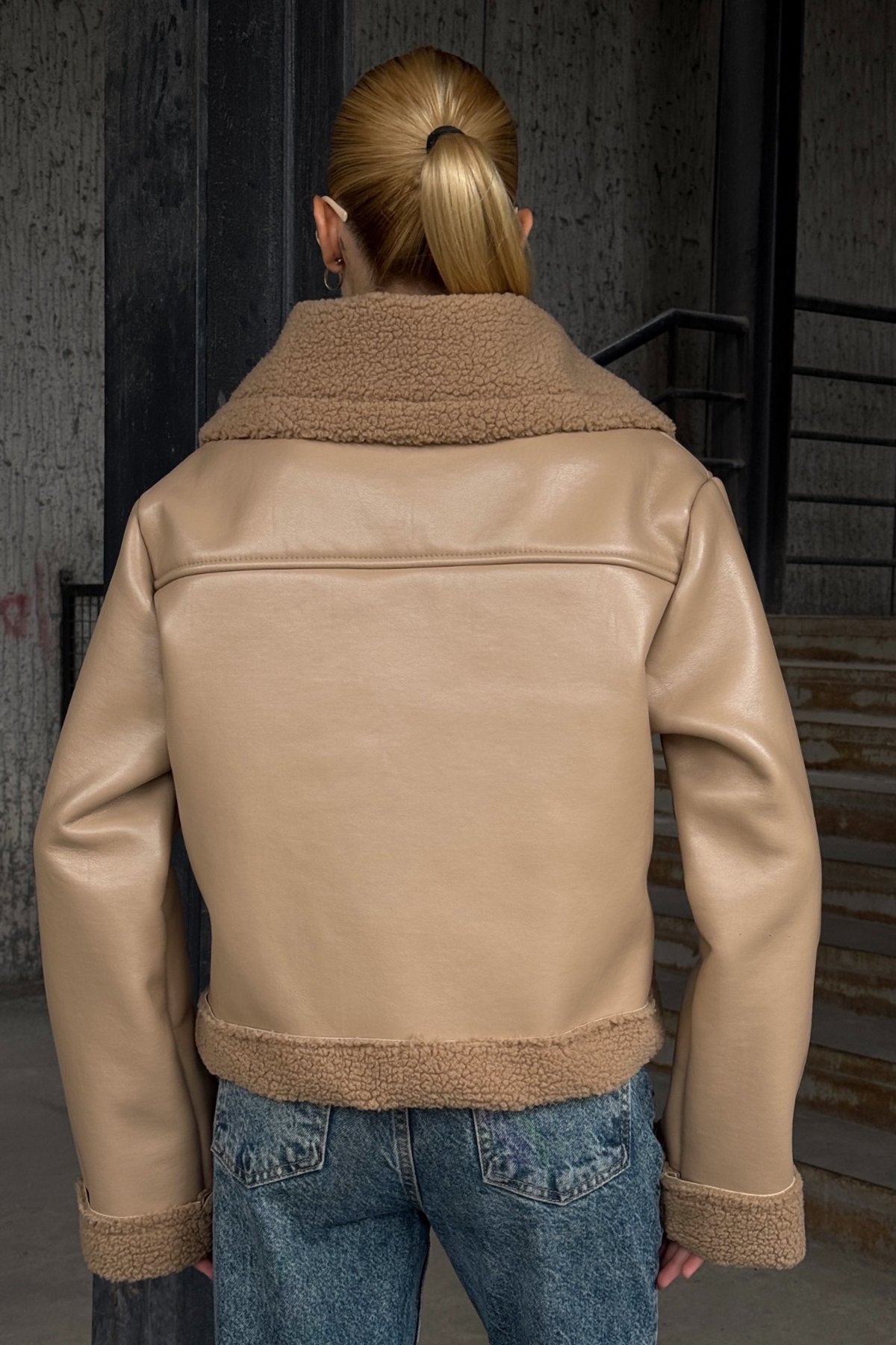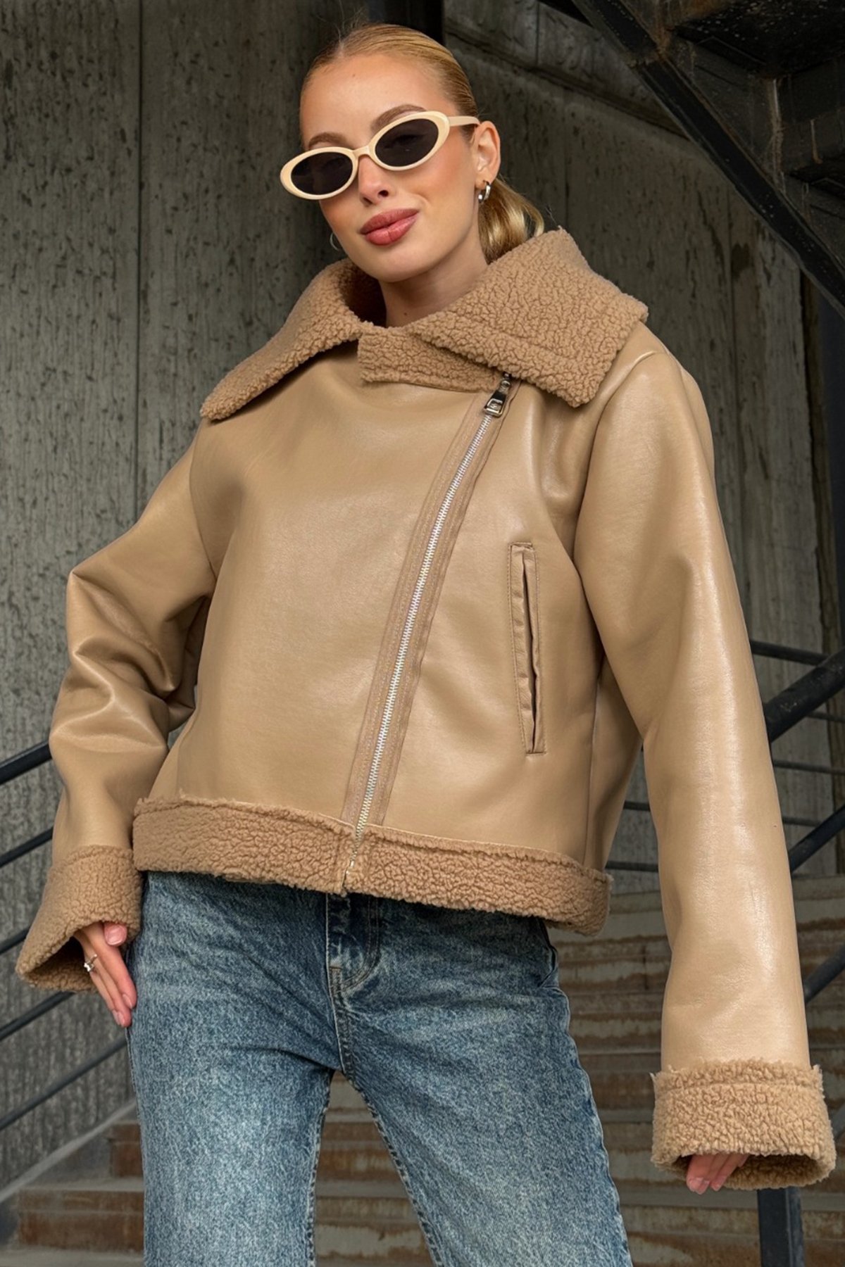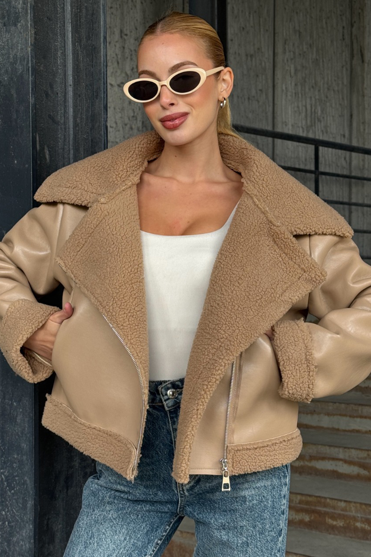 Kruvaze Yaka Fermuar Kapamalı İçi Kürklü Mont - BEJ (VS01255)