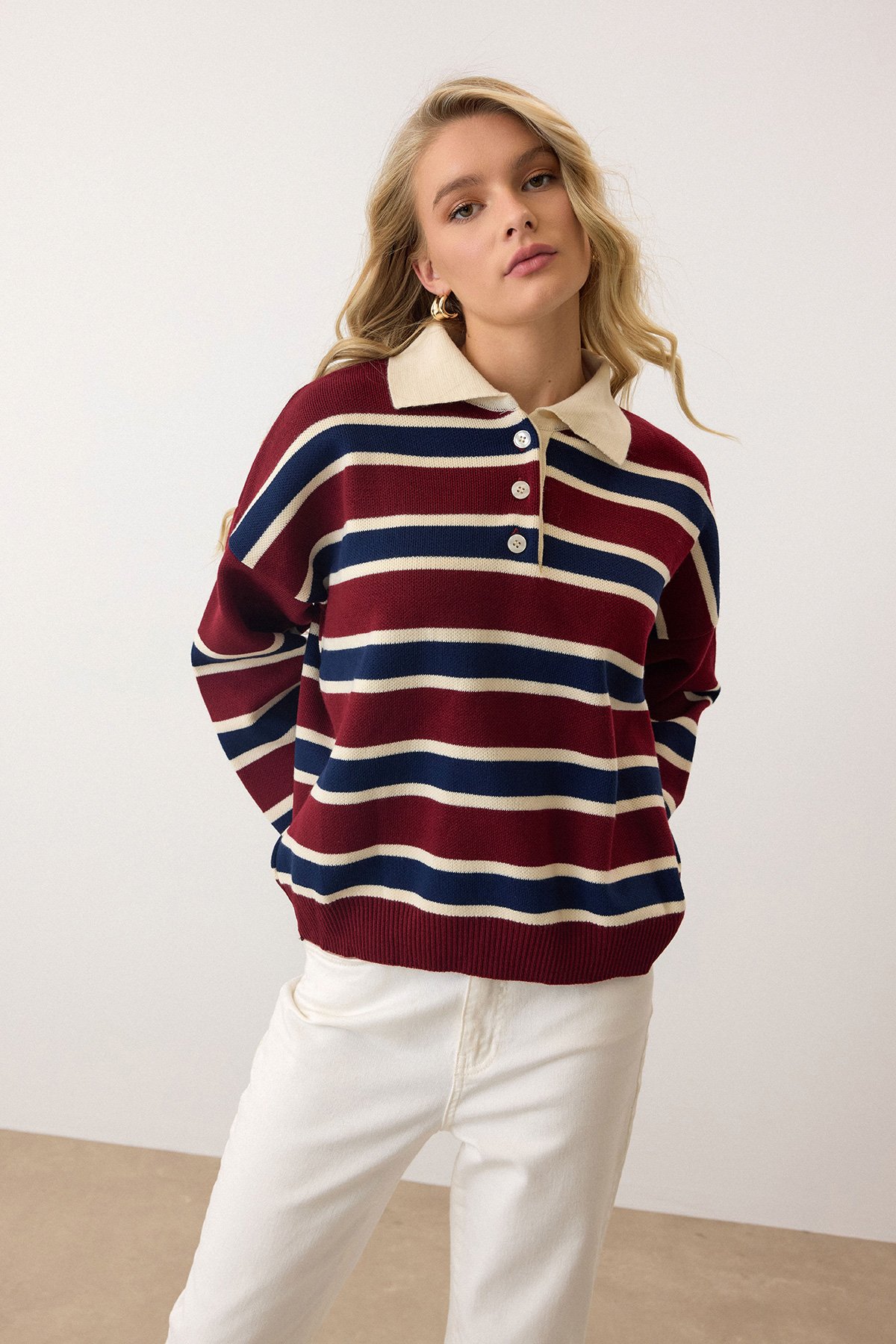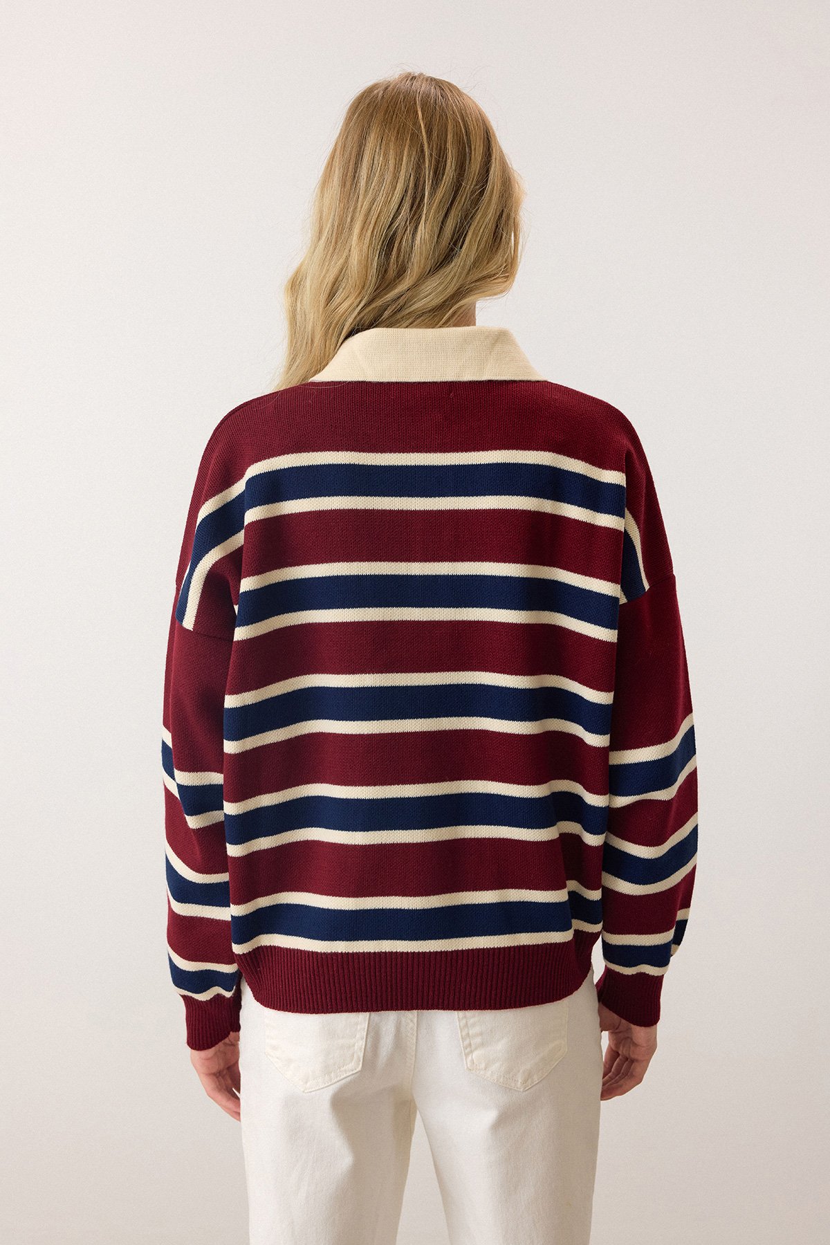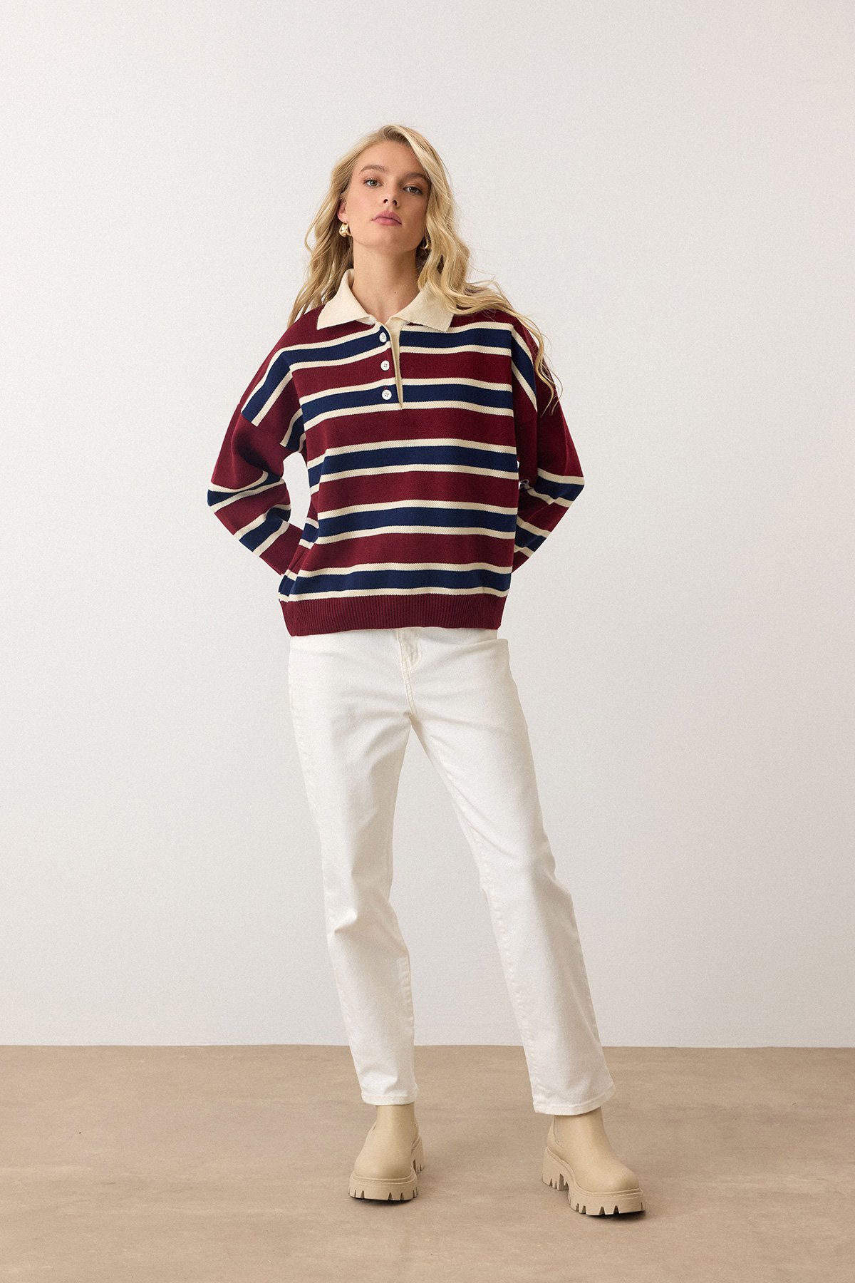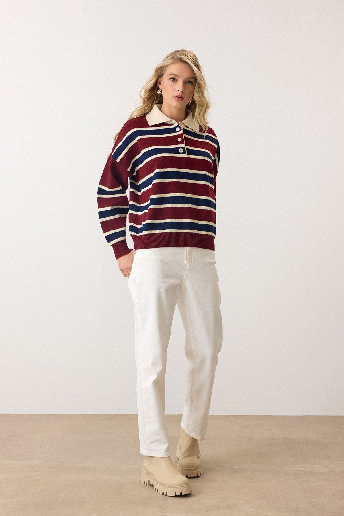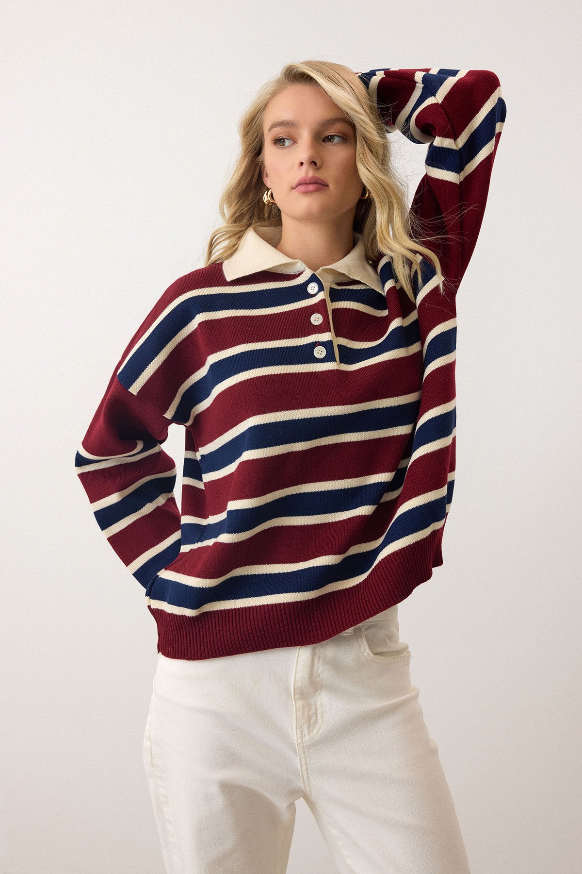 Polo Yaka Düğmeli Triko Kazak - BORDO (VS00890)