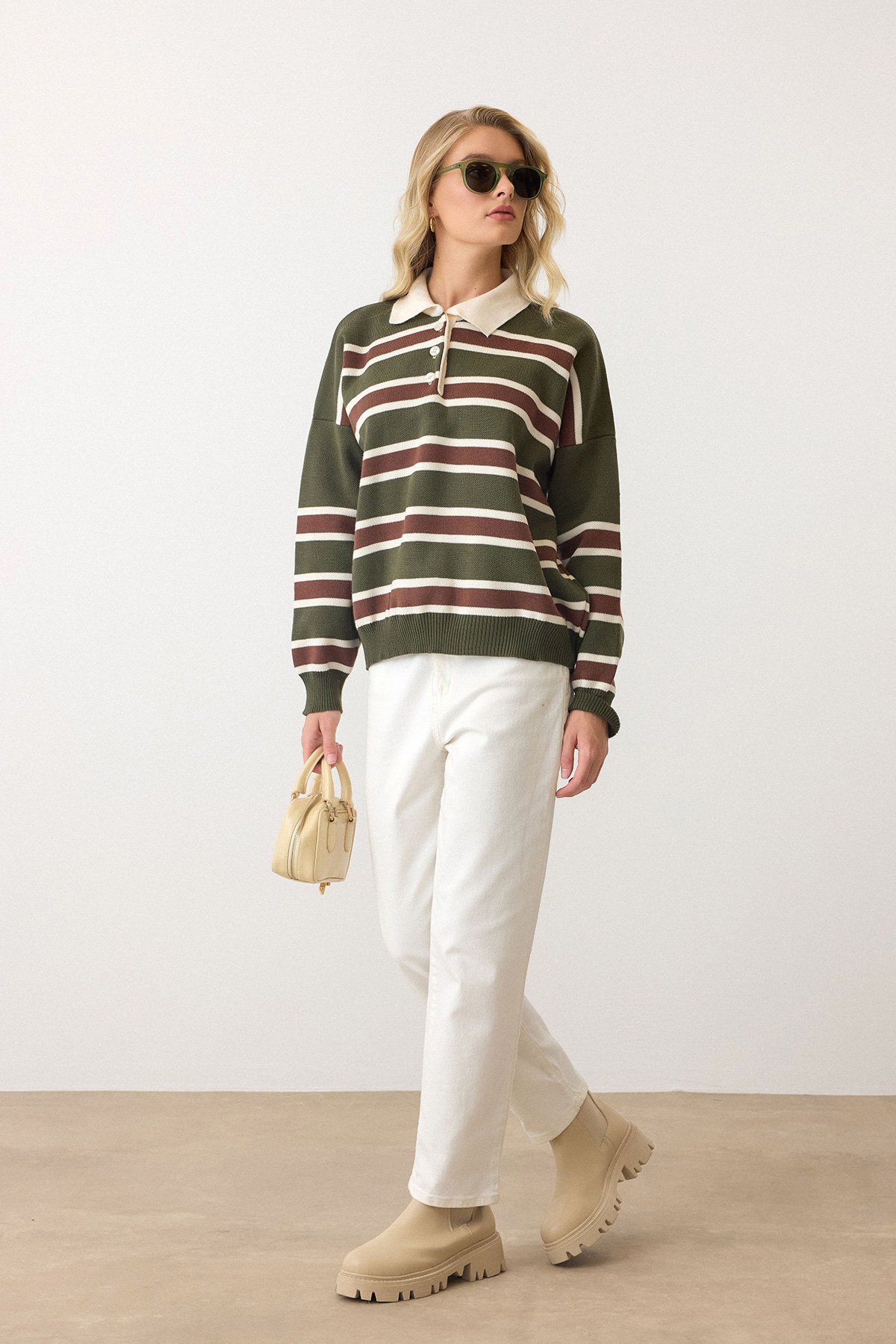 Polo Yaka Düğmeli Triko Kazak;Stüdyo Çekimlerinde Renkler Işık Farklılığından Dolayı Değişiklik Gösterebilir.;Manken Ölçüler: Boy: 1.67 Cm Göğüs: 75 Cm Bel: 62 Cm Kalça: 80 Cm Kilo: 45 Cm S/36/1 Beden