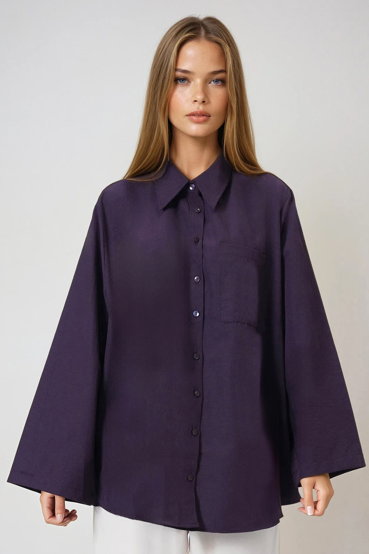 Kadın Mor Tek Cepli İspanyol Kol Oversize Gömlek VS01016 Kadın Lacivert Tek Cepli İspanyol Kol Oversize Gömlek VS01016 Kadın Beyaz Tek Cepli İspanyol Kol Oversize Gömlek VS01016