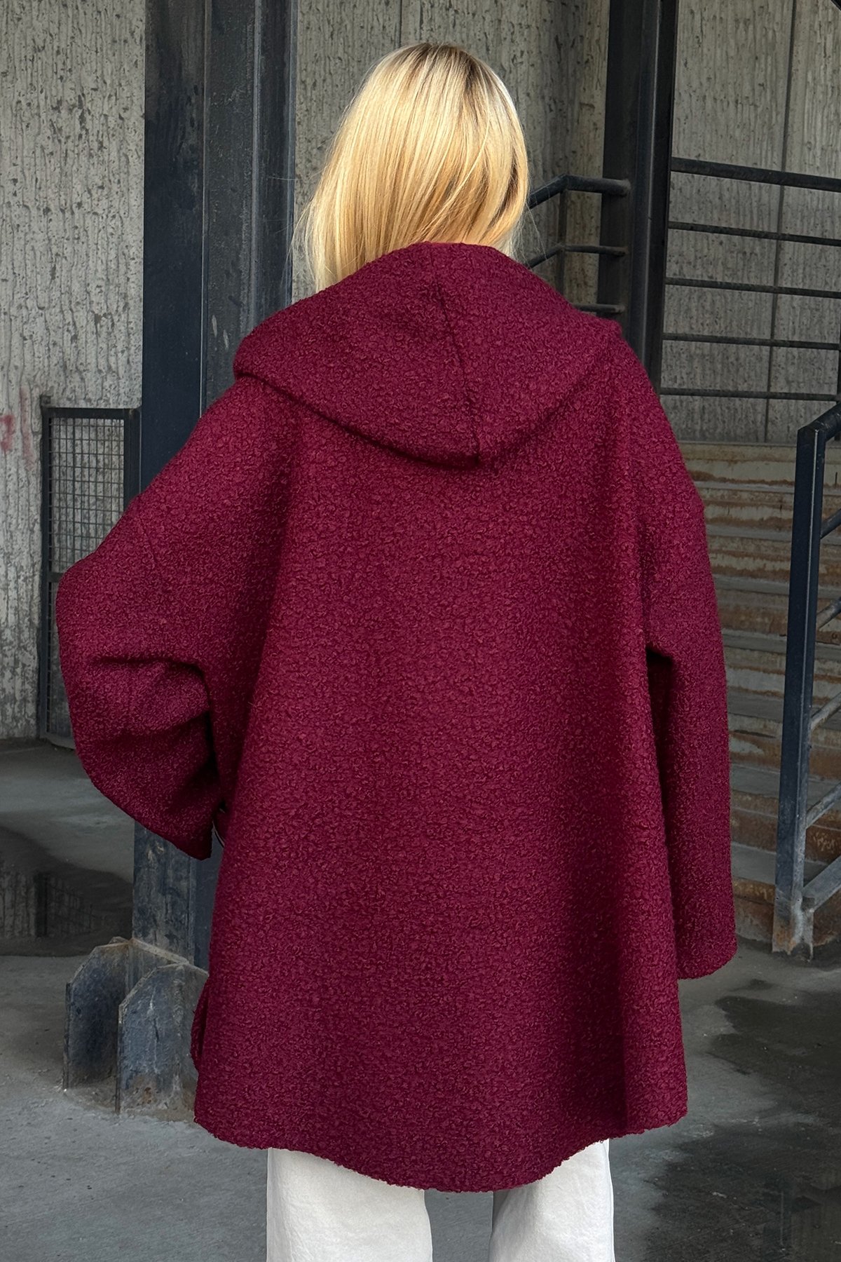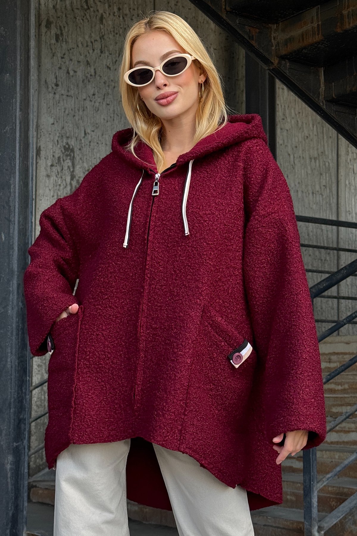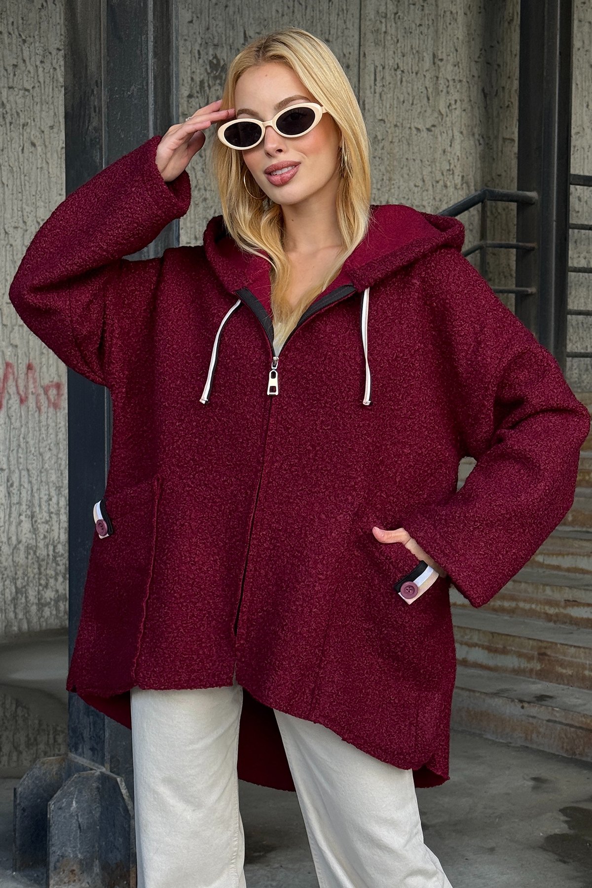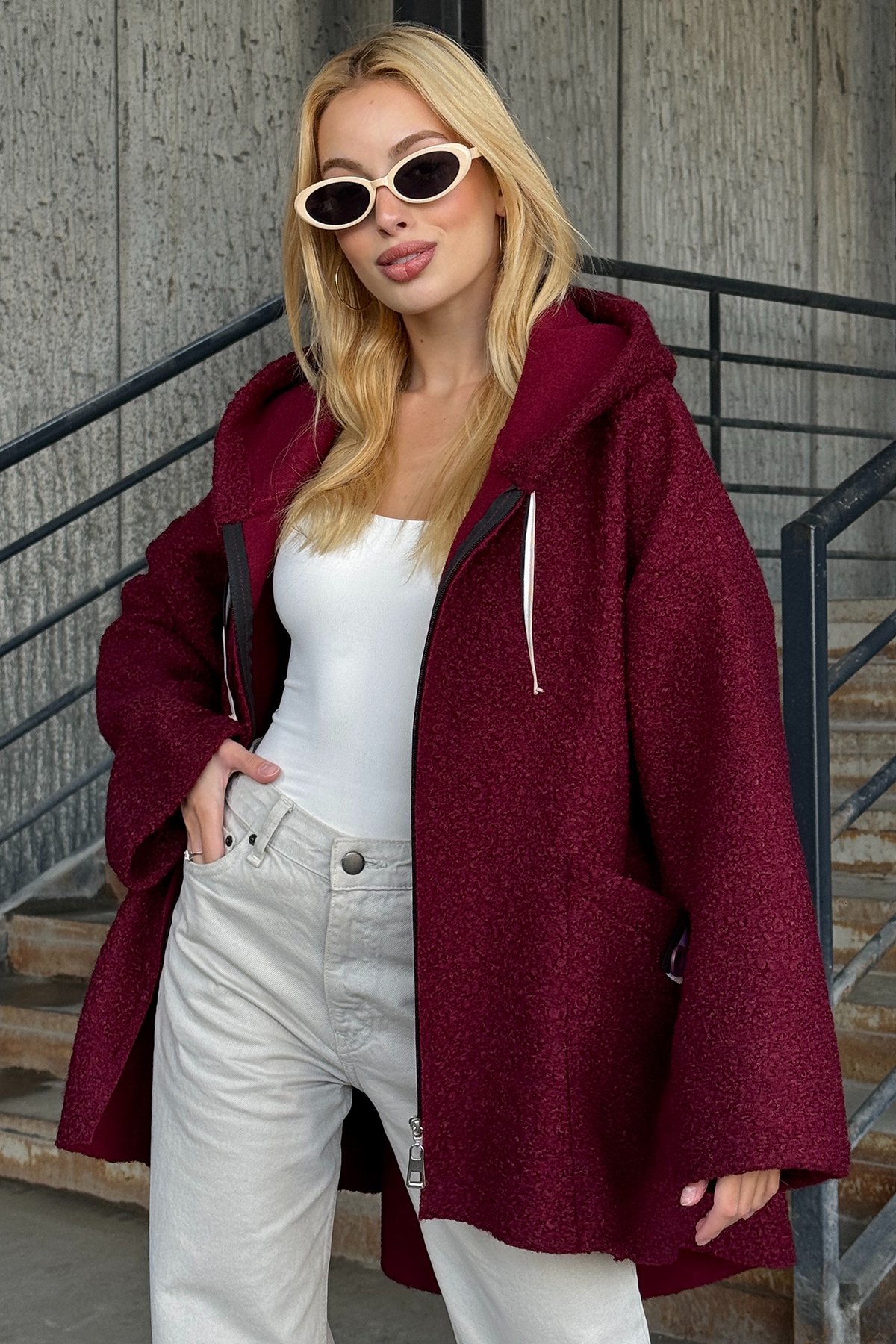 Torba Cepli Kapüşonlu Fermuar Kapamalı Kaşe Kaban - BORDO (VS01289)