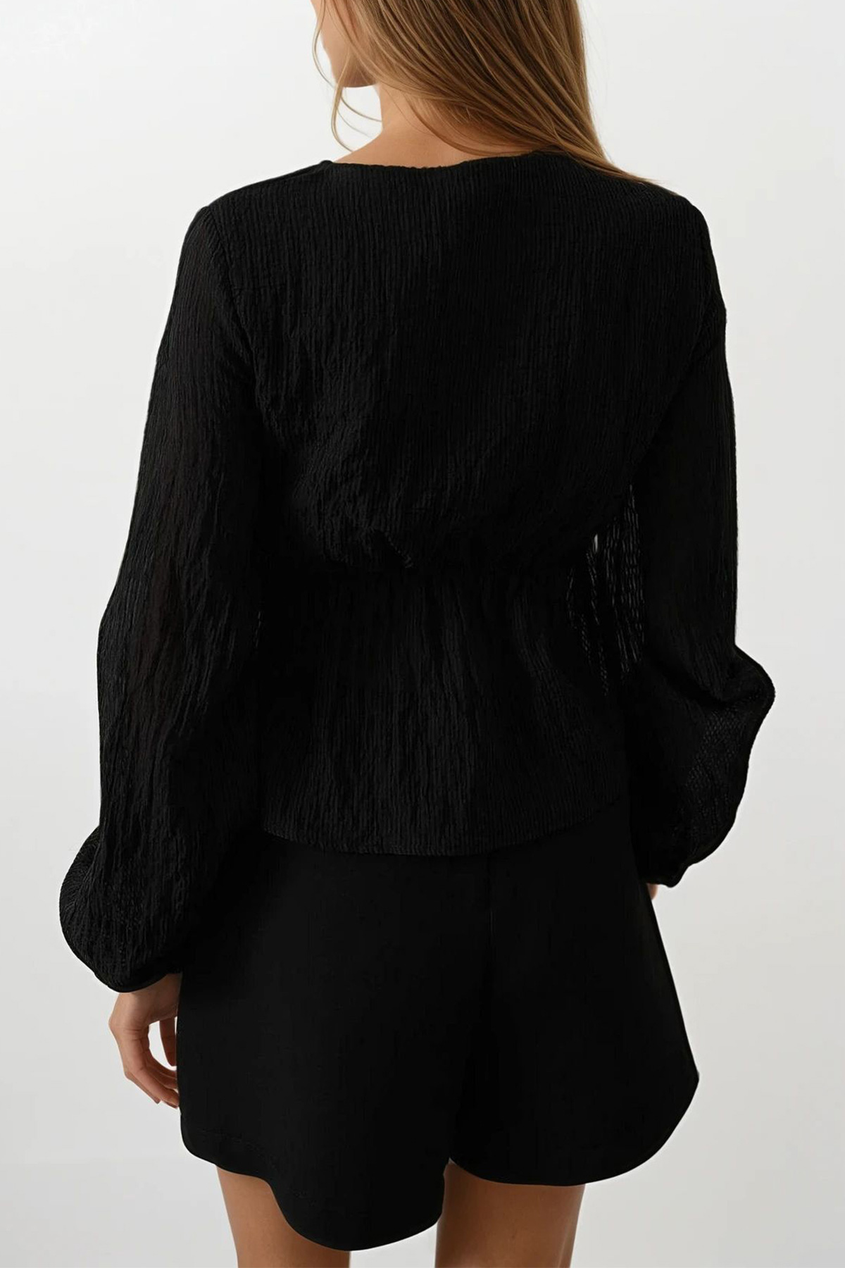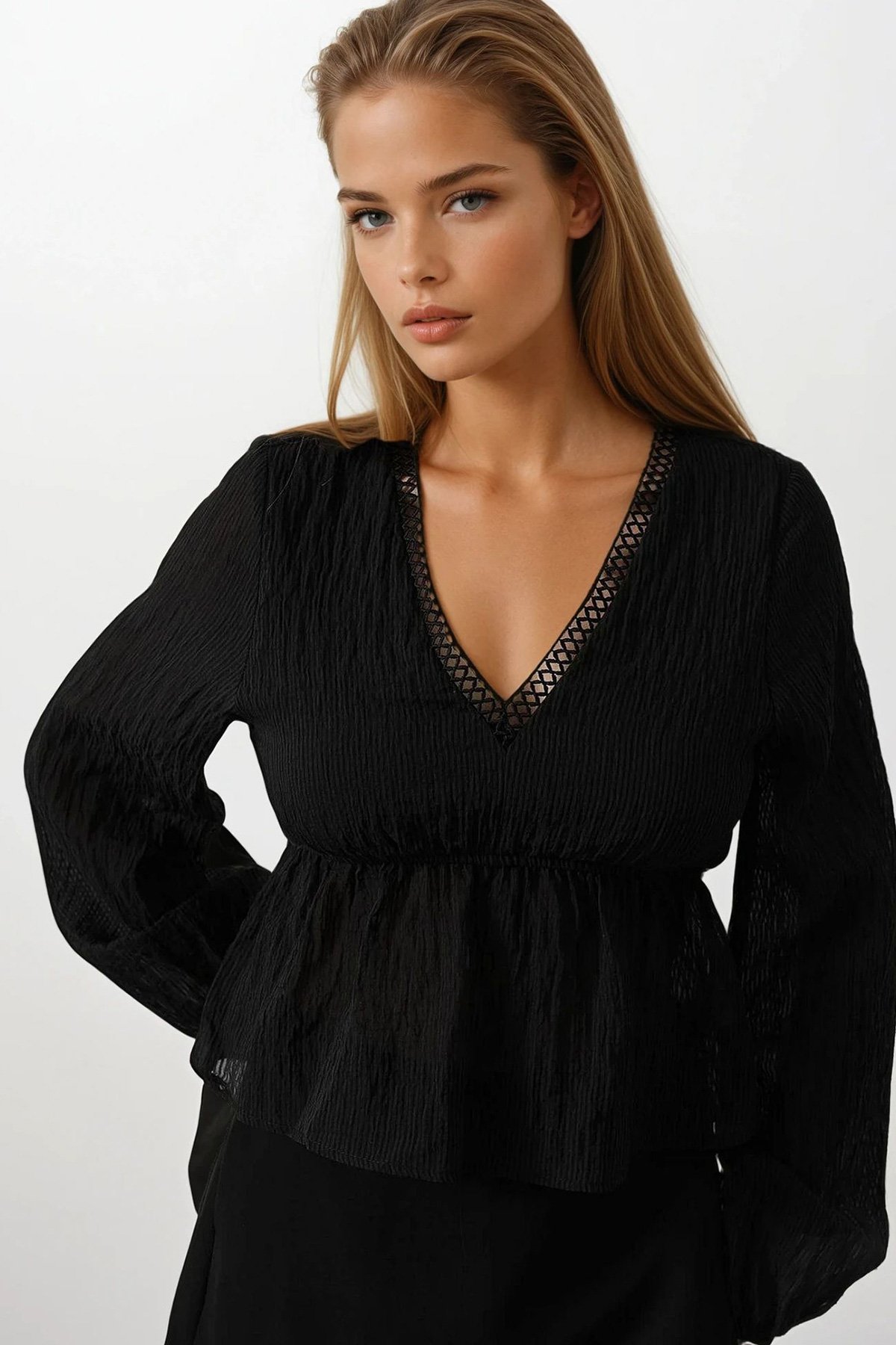 V Yaka Dantelli Eteği Fırfırlı Bluz (VS00575)