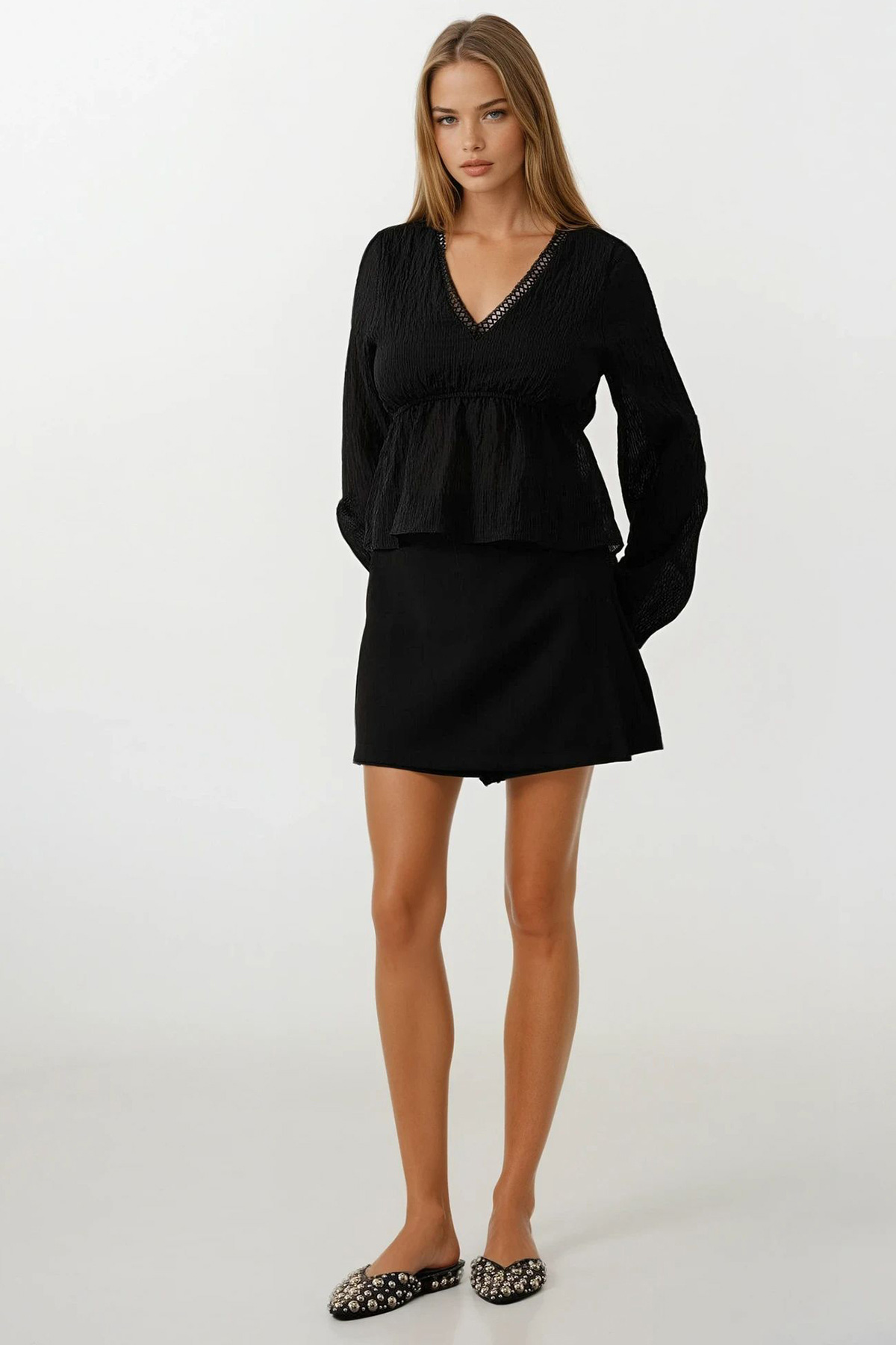 V Yaka Dantelli Eteği Fırfırlı Bluz;Stüdyo Çekimlerinde Renkler Işık Farklılığından Dolayı Değişiklik Gösterebilir.;Model Ölçüler: Boy: 1.67 Cm Göğüs: 75 Cm Bel: 62 Cm Kalça: 80 Cm Kilo: 45 Cm S/36/1 Beden