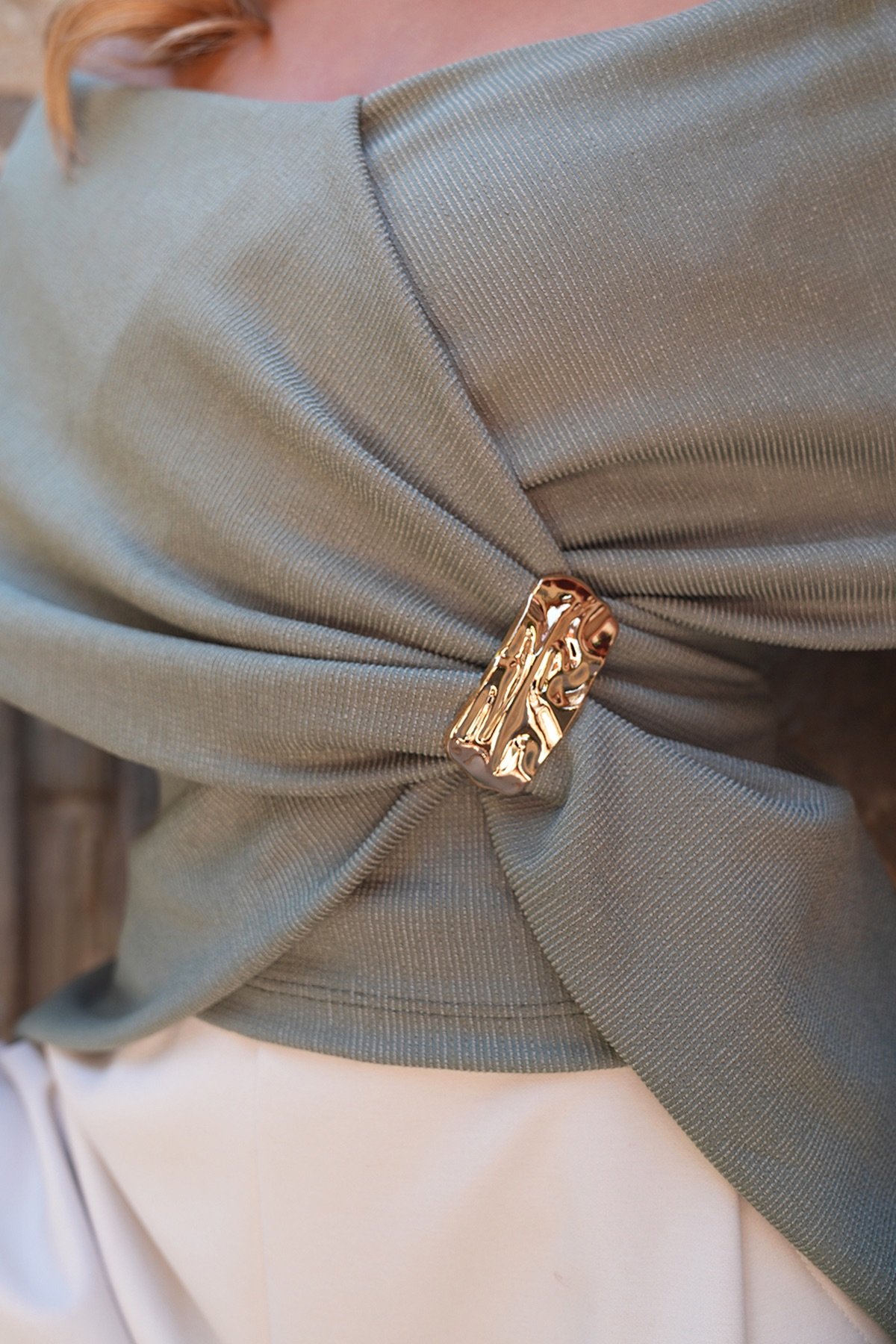 V Yaka Drape Detaylı Metal Aksesuarlı Tasarım Bluz - Yeşil V Yaka Drape Detaylı Metal Aksesuarlı Tasarım Bluz - Bej