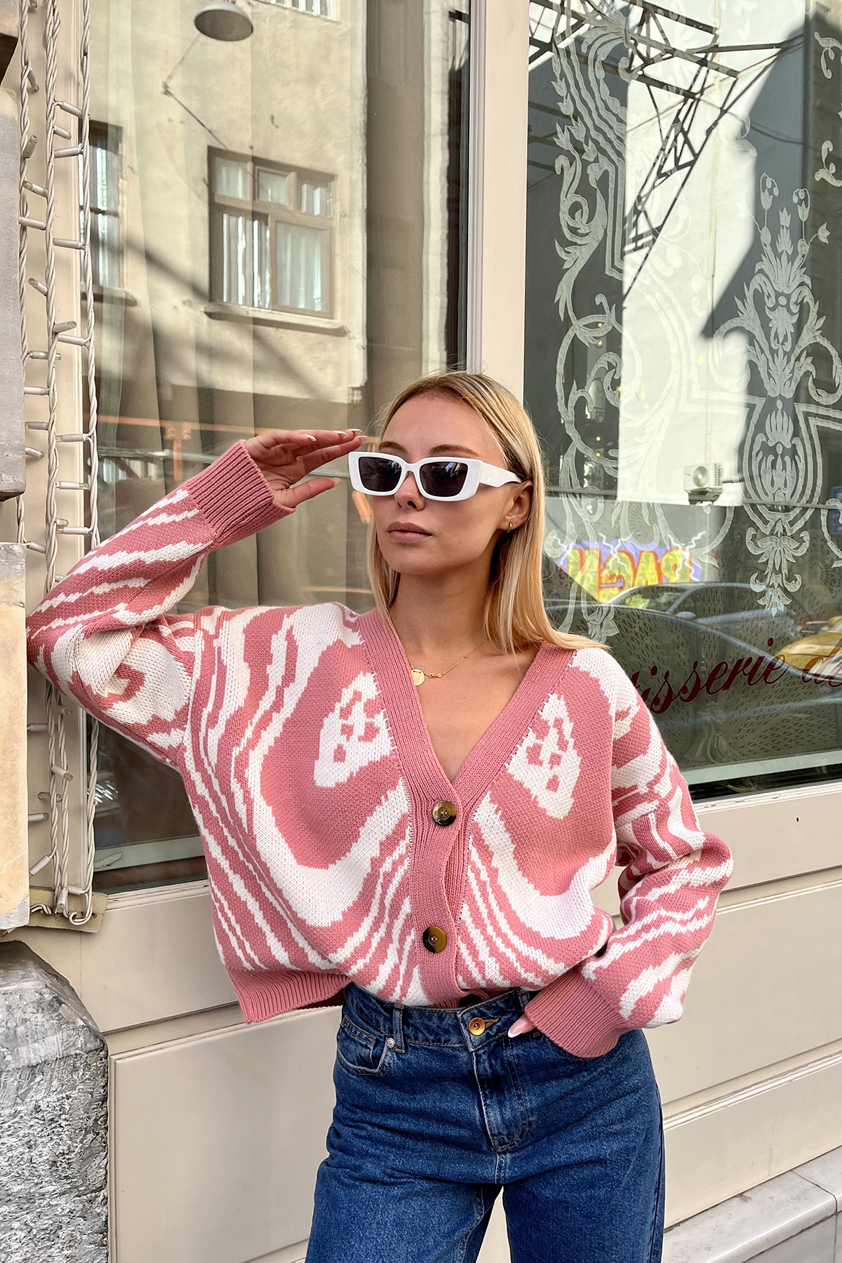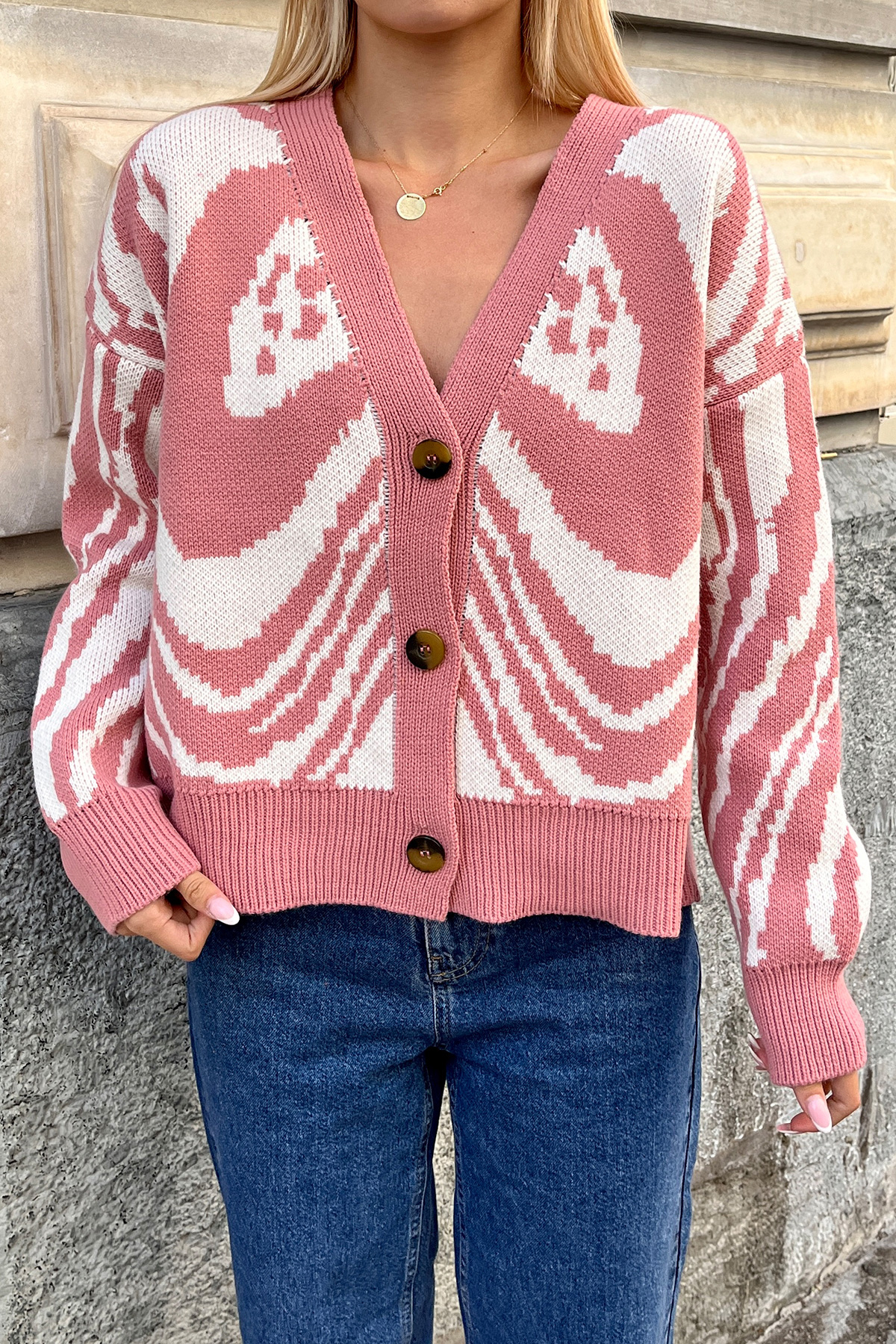 Kadın Pudra V Yaka Düğmeli Soyut Desen Kalın Örme Hırka ESQ7639 (ESQ7639)