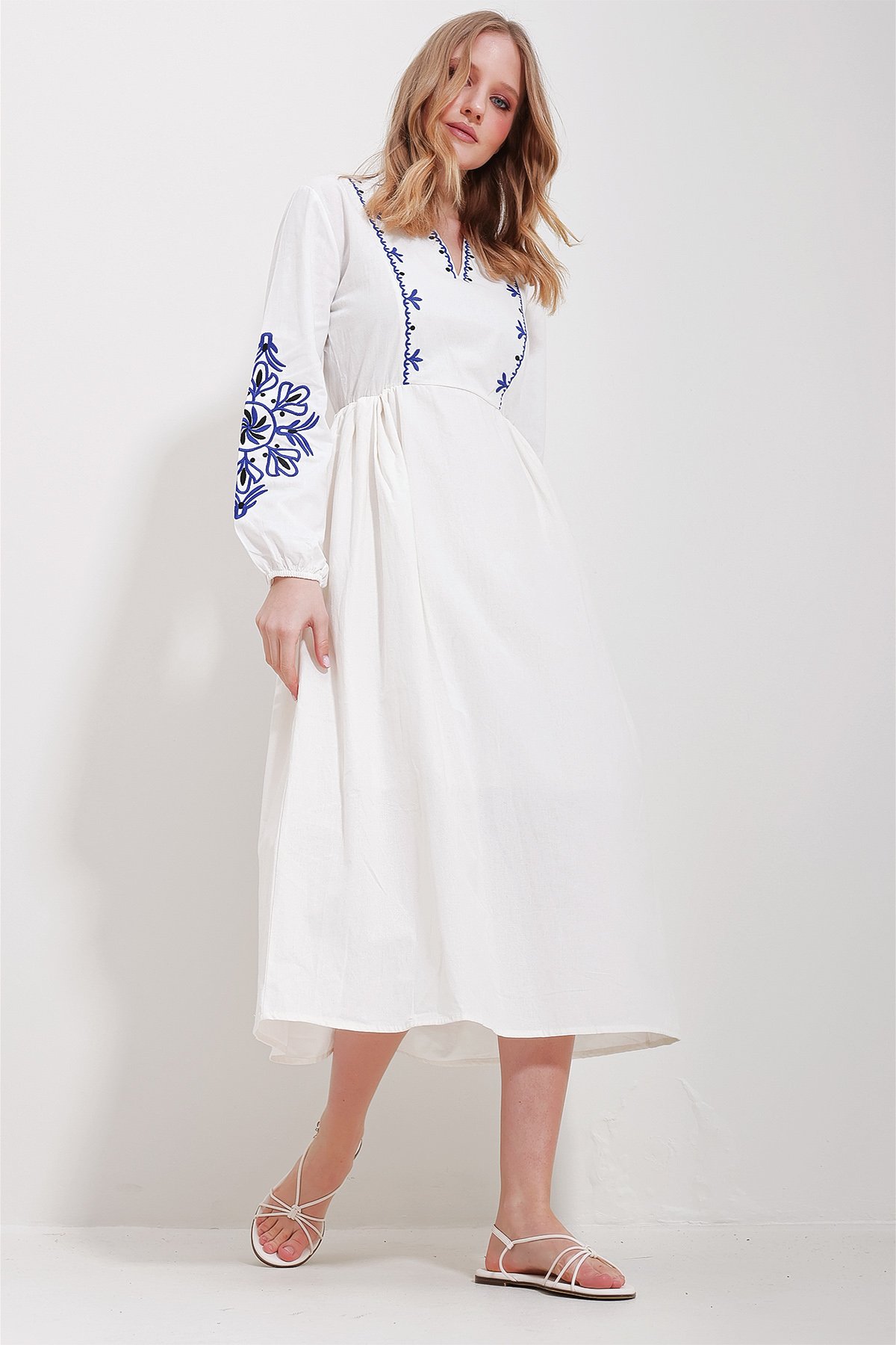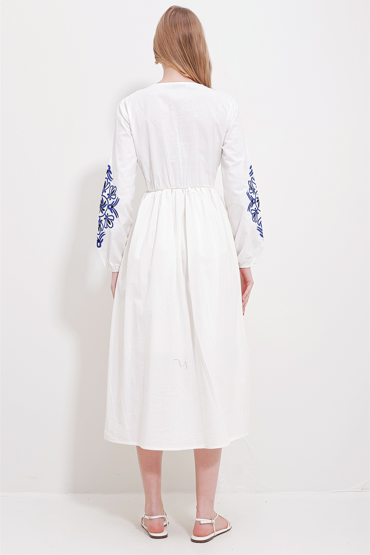 Kadın Beyaz V Yaka İçi Astarlı Keten Nakışlı Midi Boy Elbise ALC-X11569 (ALC-X11569)