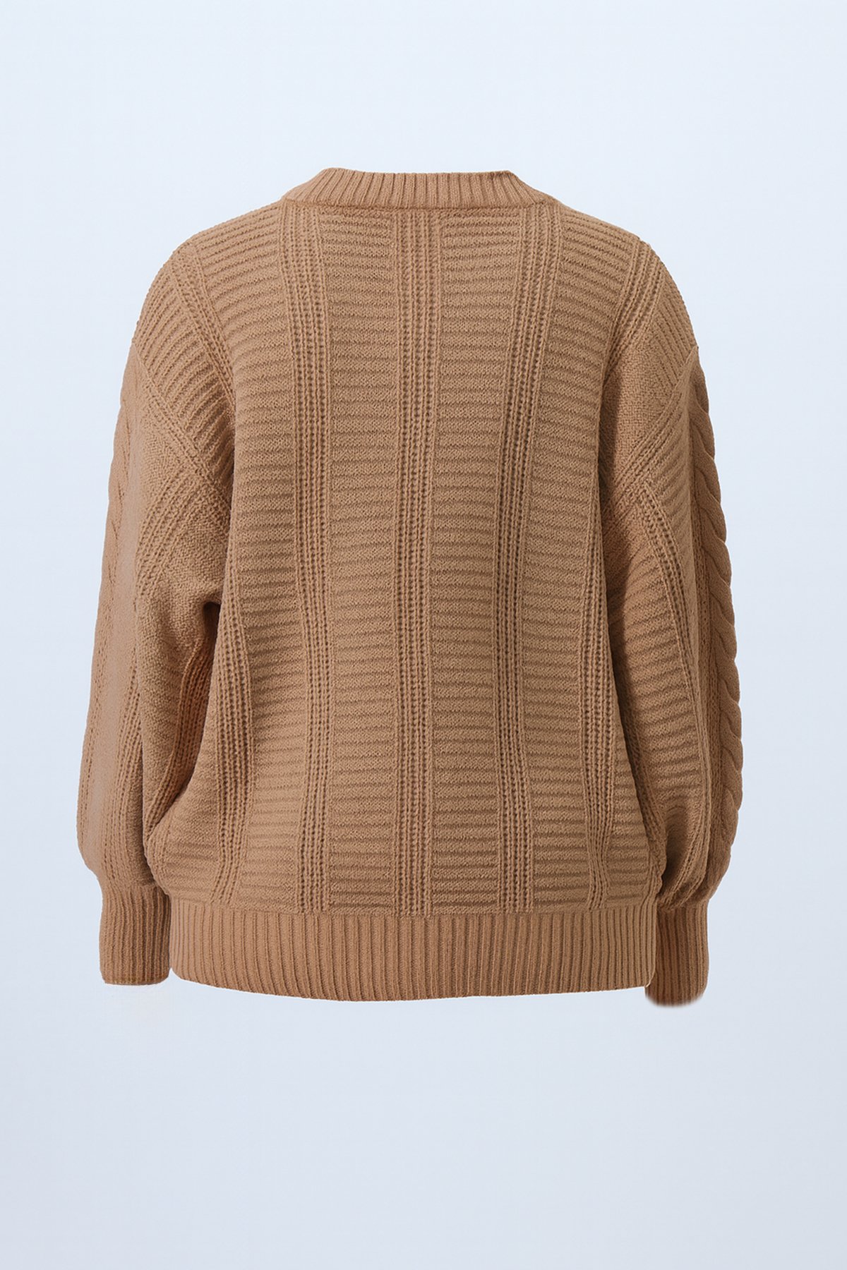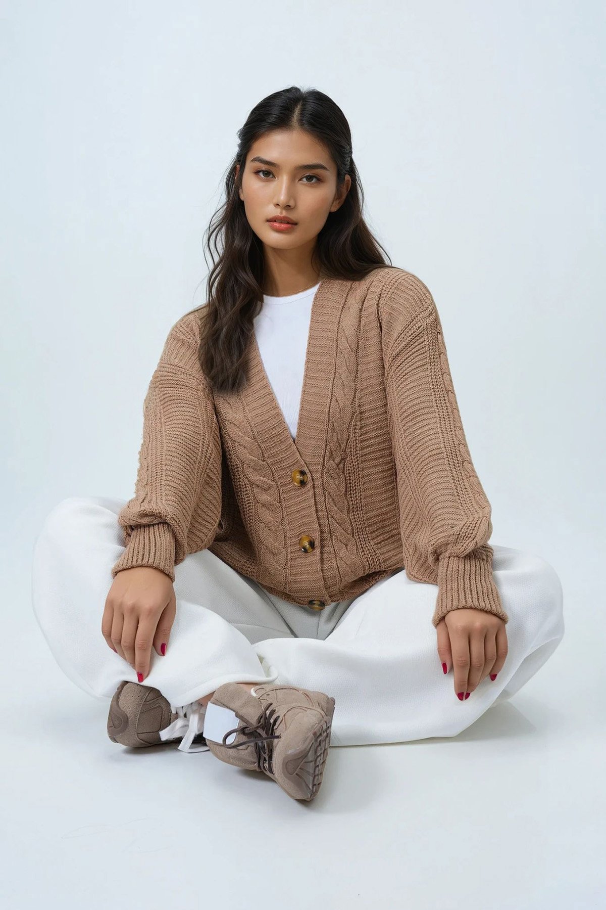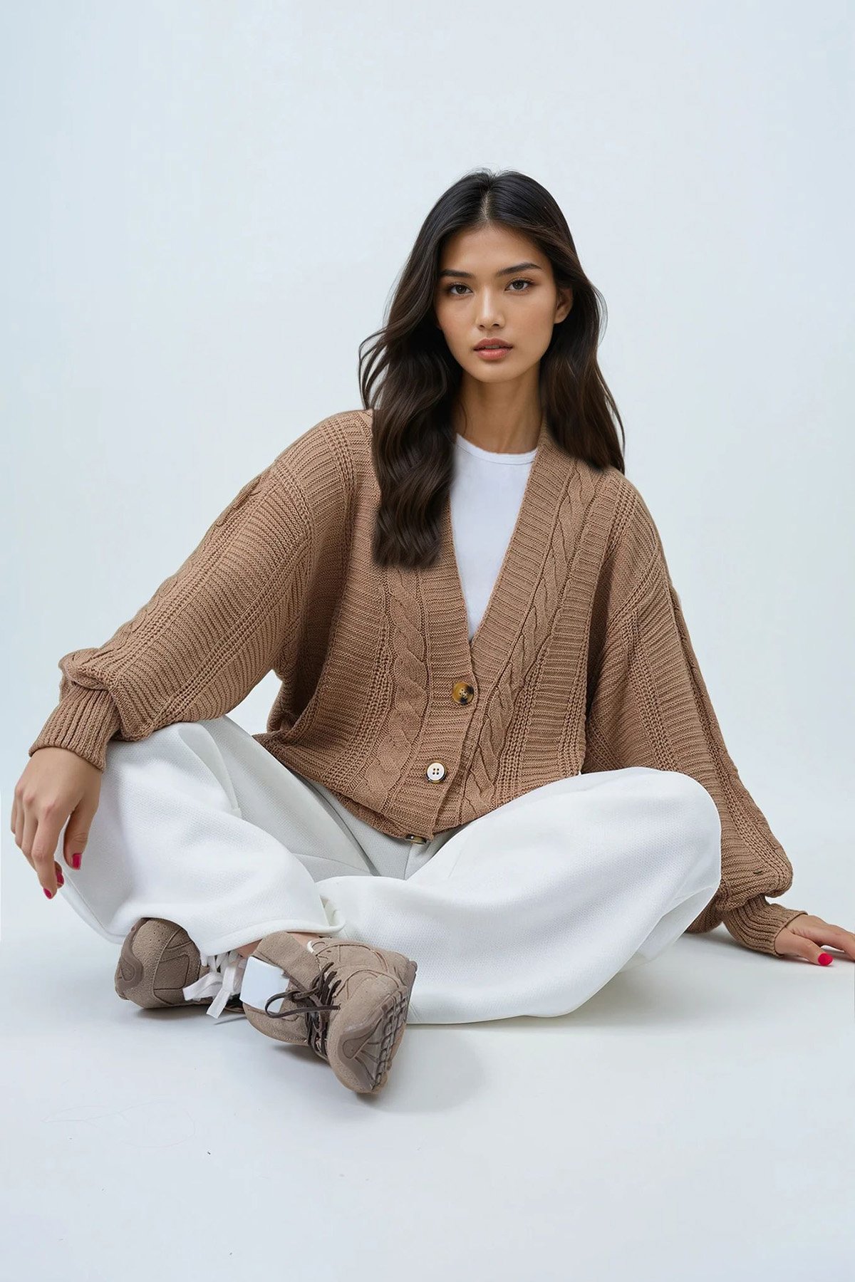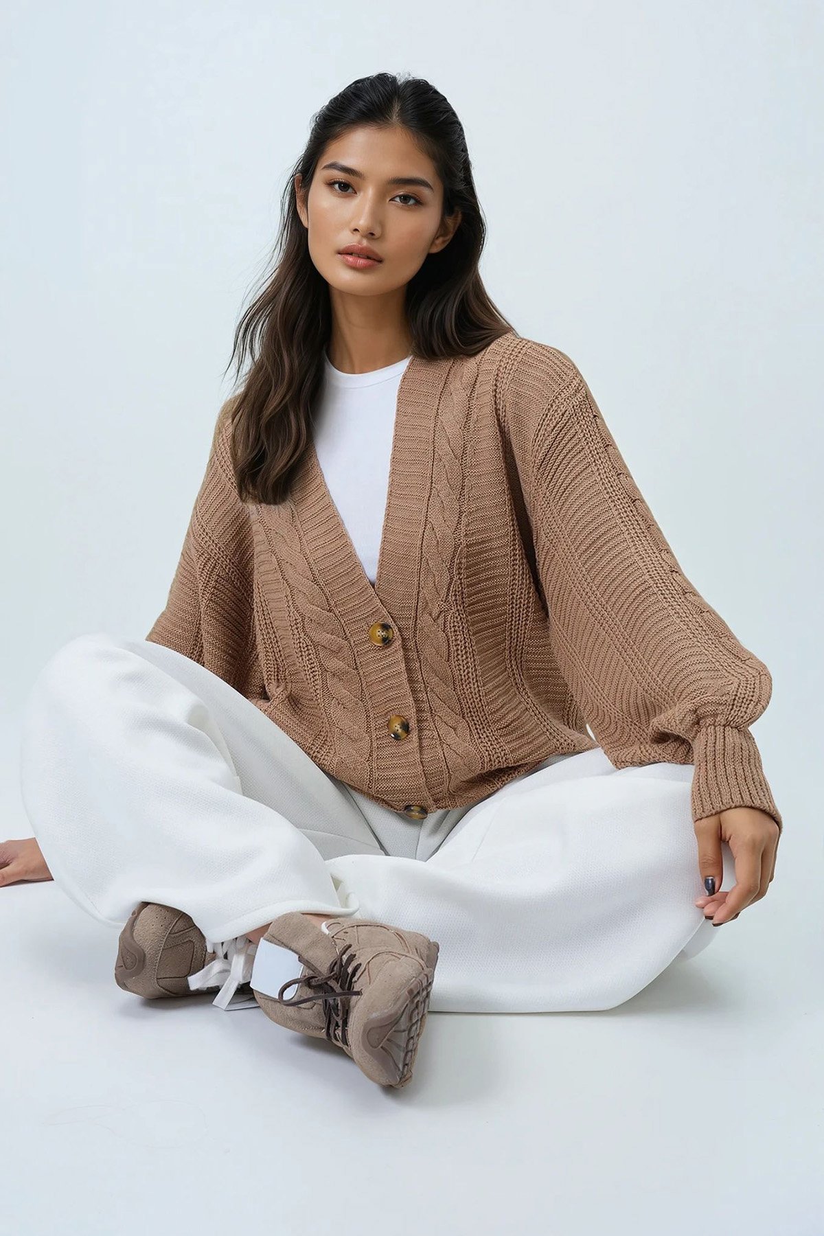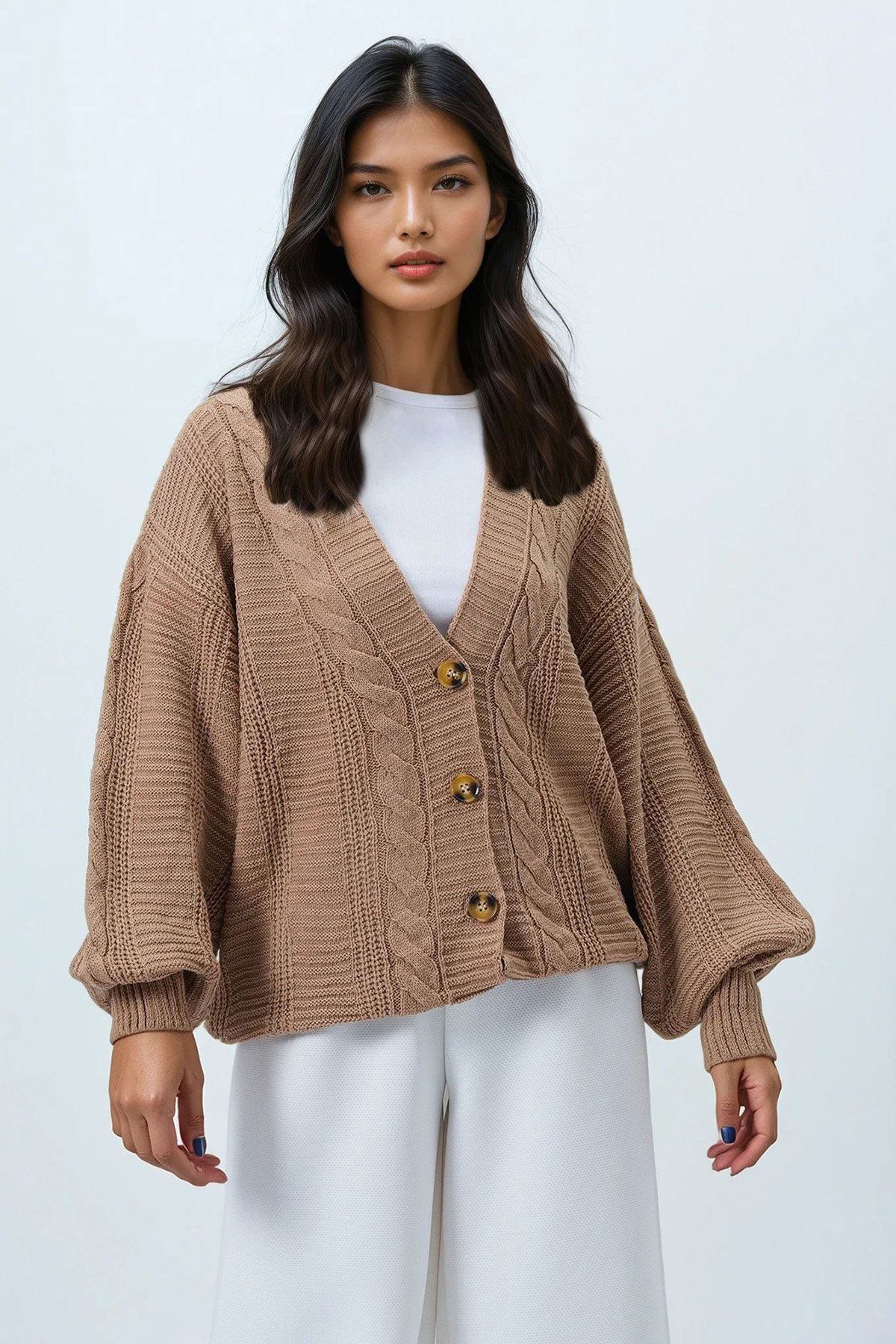 V Yaka Saç Örgü Desenli Balon Kol Triko Hırka - Bisküvi (ALC-X14438)