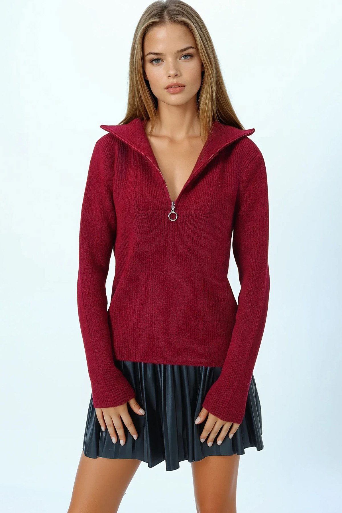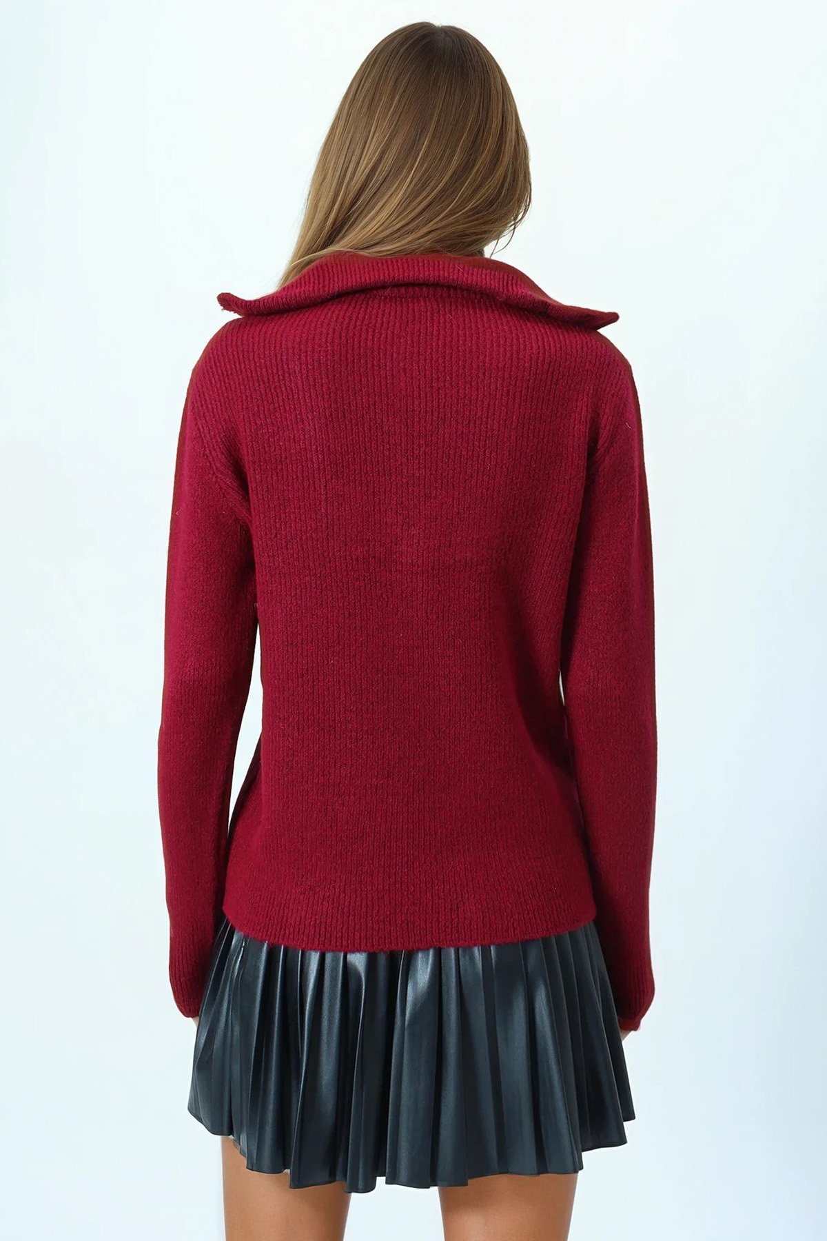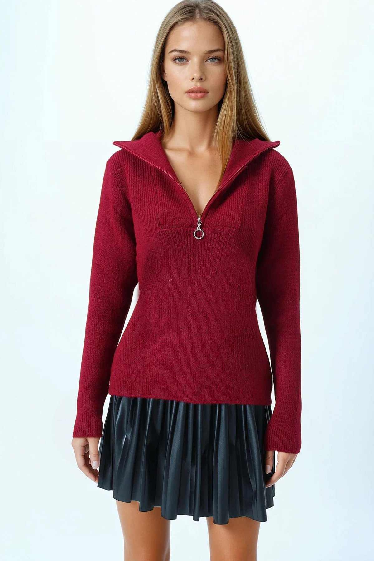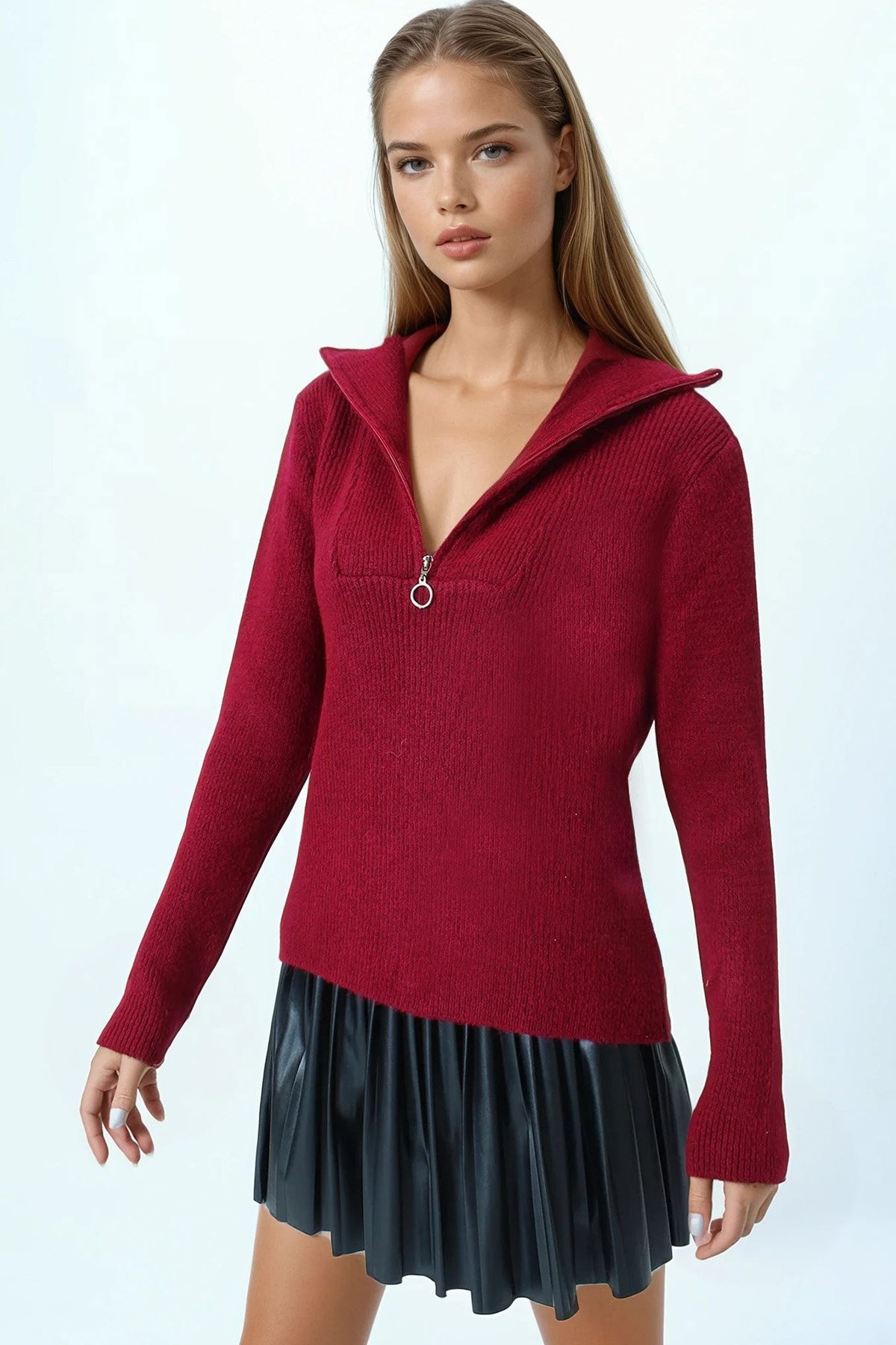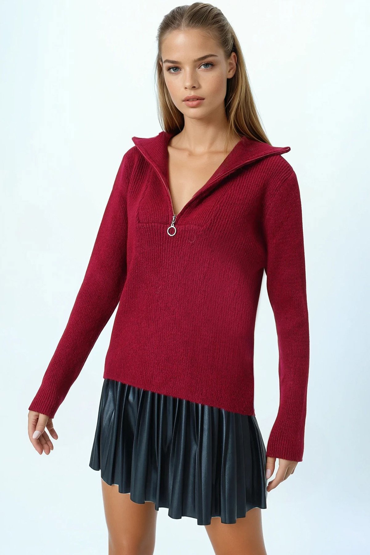 Yarım Fermuarlı Dik Yaka Triko Bluz - BORDO (VS01058)